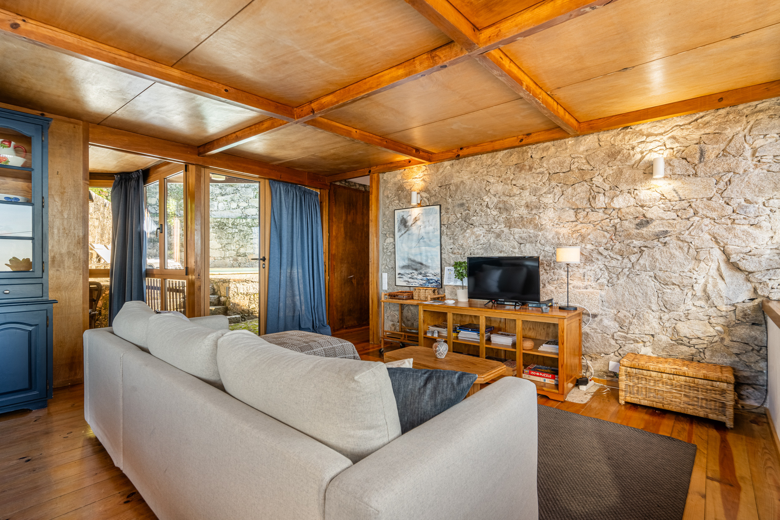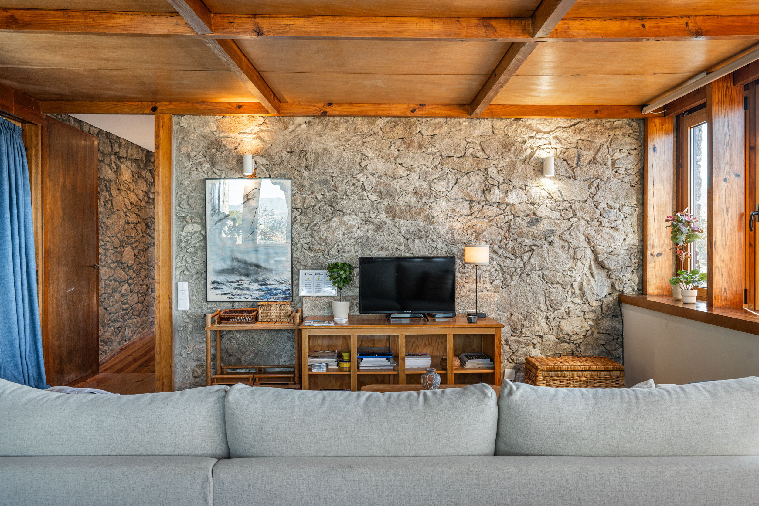 Aus authentischem Minhota-Stein gebaut, vereint die Hütte rustikalen Charme mit modernen Annehmlichkeiten und bietet einen ruhigen Rückzugsort, an dem Komfort, Natur und Meeresblicke wunderschön zusammenkommen.