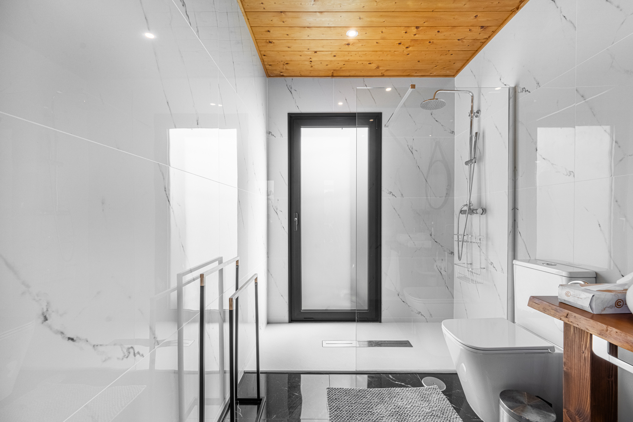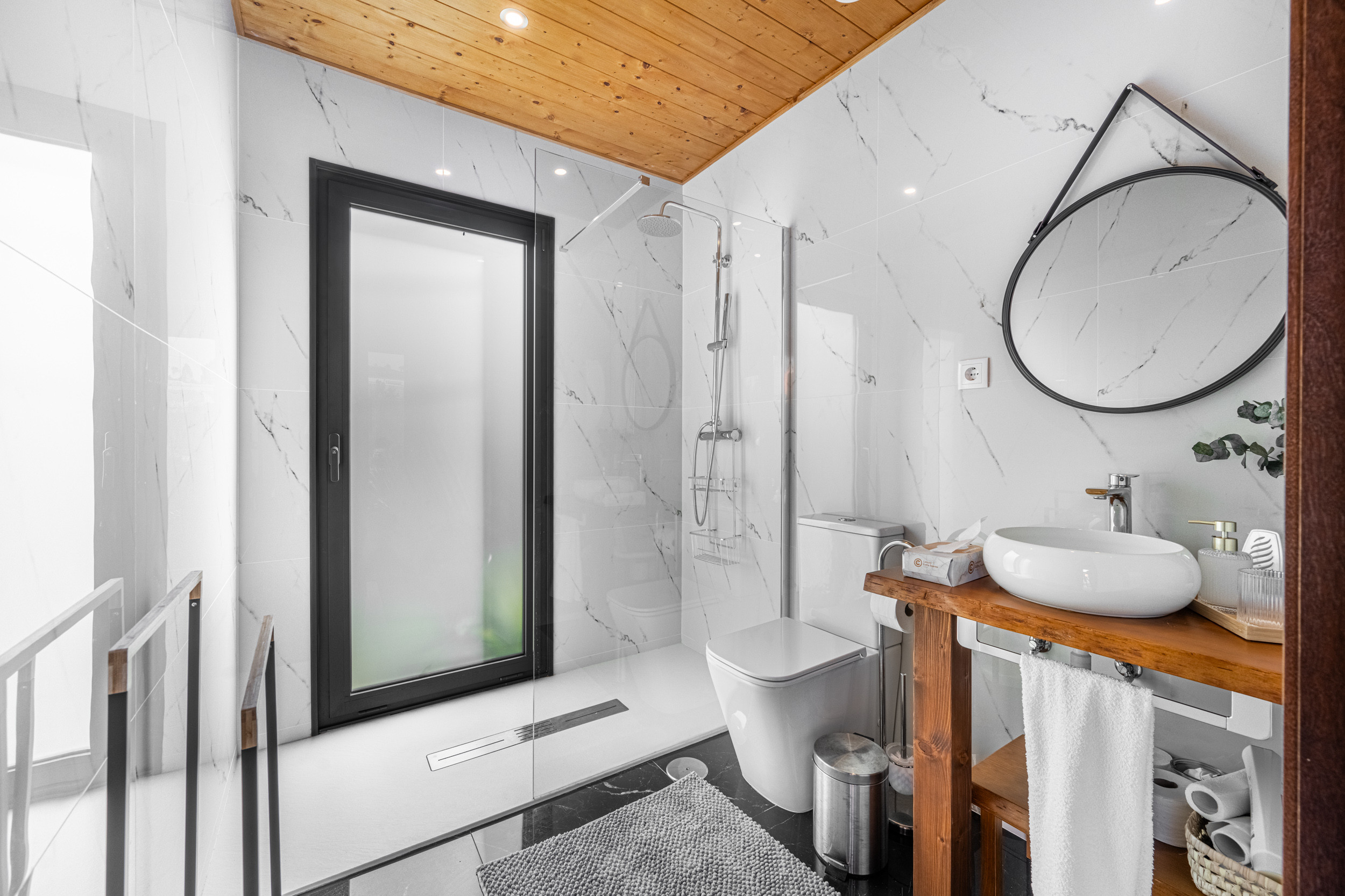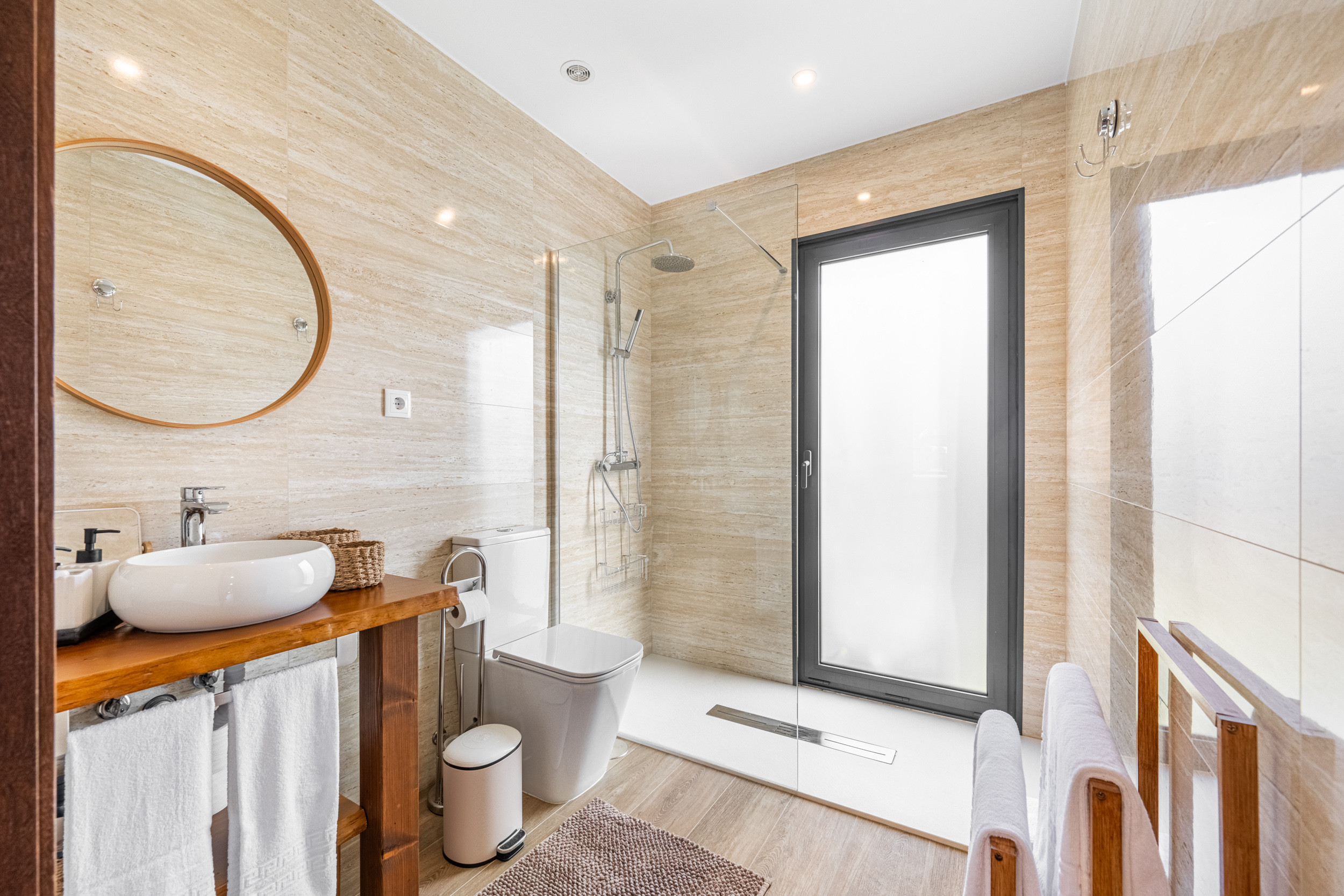 Im Obergeschoss befinden sich zwei Doppelschlafzimmer und ein Zweibettzimmer, jedes mit eigenem Duschbad für mehr Privatsphäre und Komfort. Das Hauptschlafzimmer verfügt über einen eigenen Balkon mit Blick auf den Swimmingpool, der zum Entspannen einlädt.