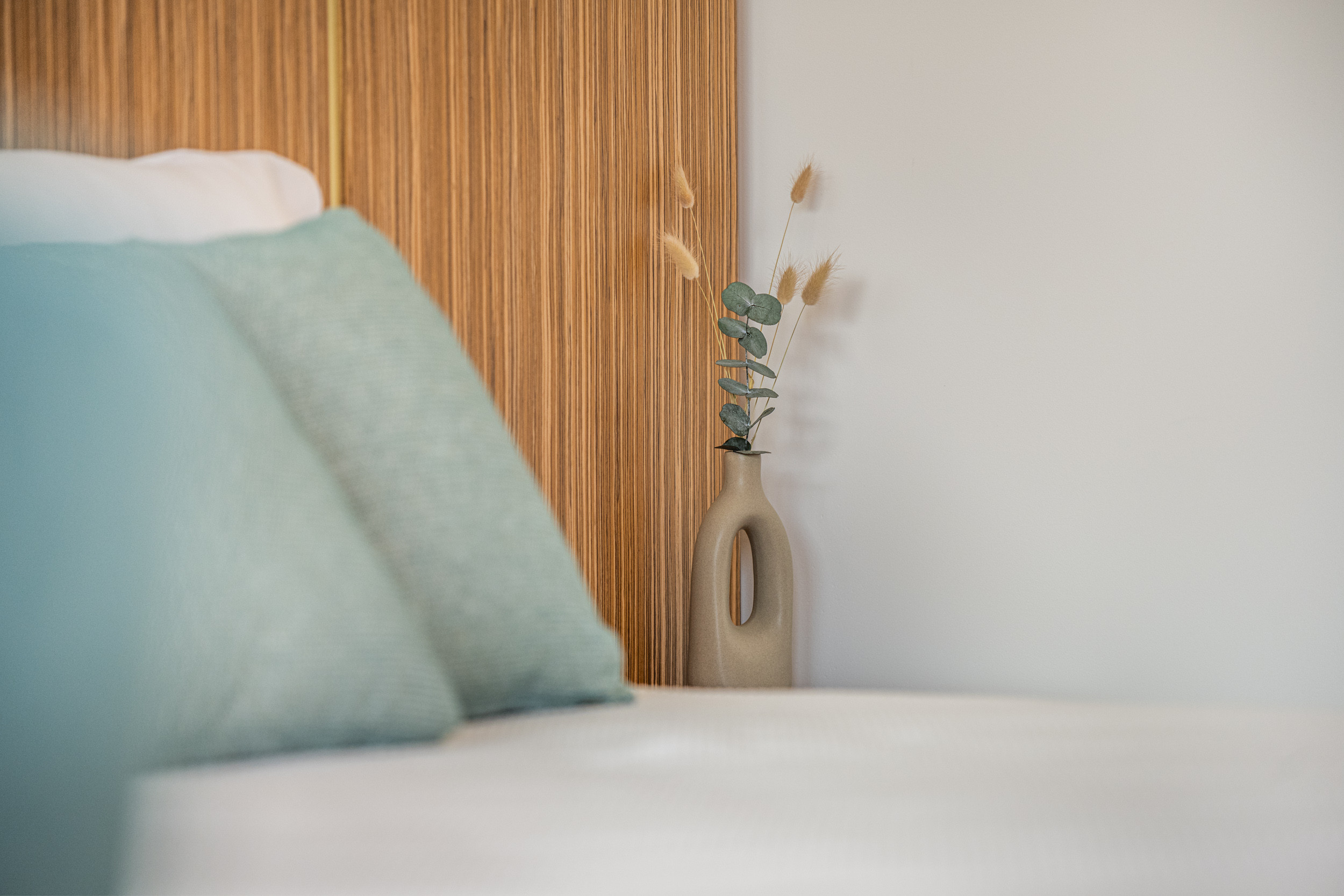 Schlafzimmer mit Doppelbett: Ein gemütliches und stilvolles Schlafzimmer mit eigenem Bad, das Gästen, die im Erdgeschoss wohnen, zusätzlichen Komfort und Zugänglichkeit bietet.