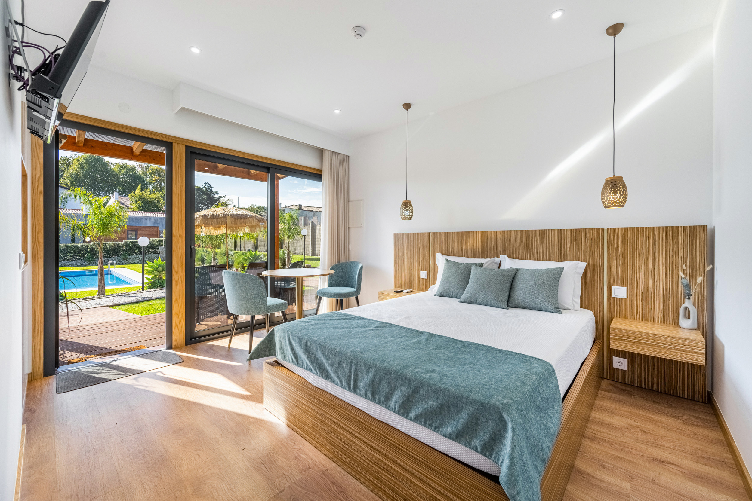 Drei Doppelzimmer mit eigenem Bad, mit Minibar und Türen, die zur Terrasse mit Tisch und Stühlen und zum Hauptpool führen