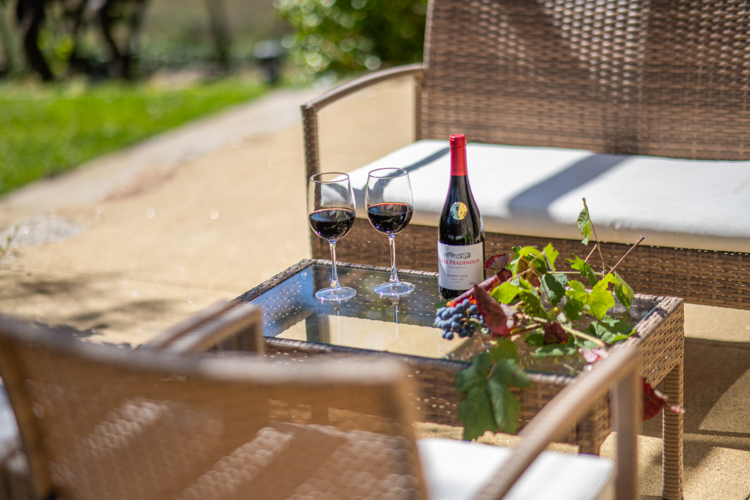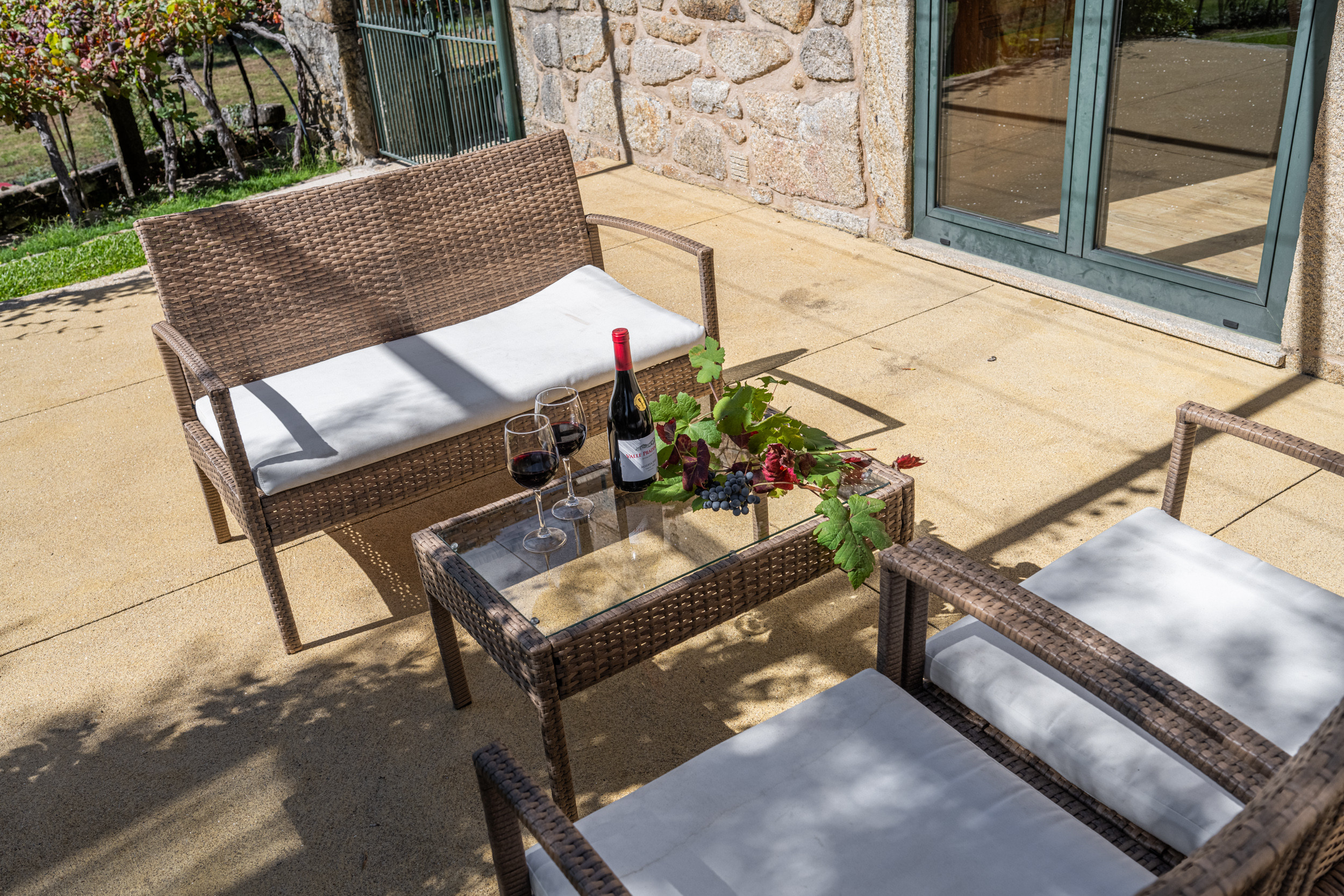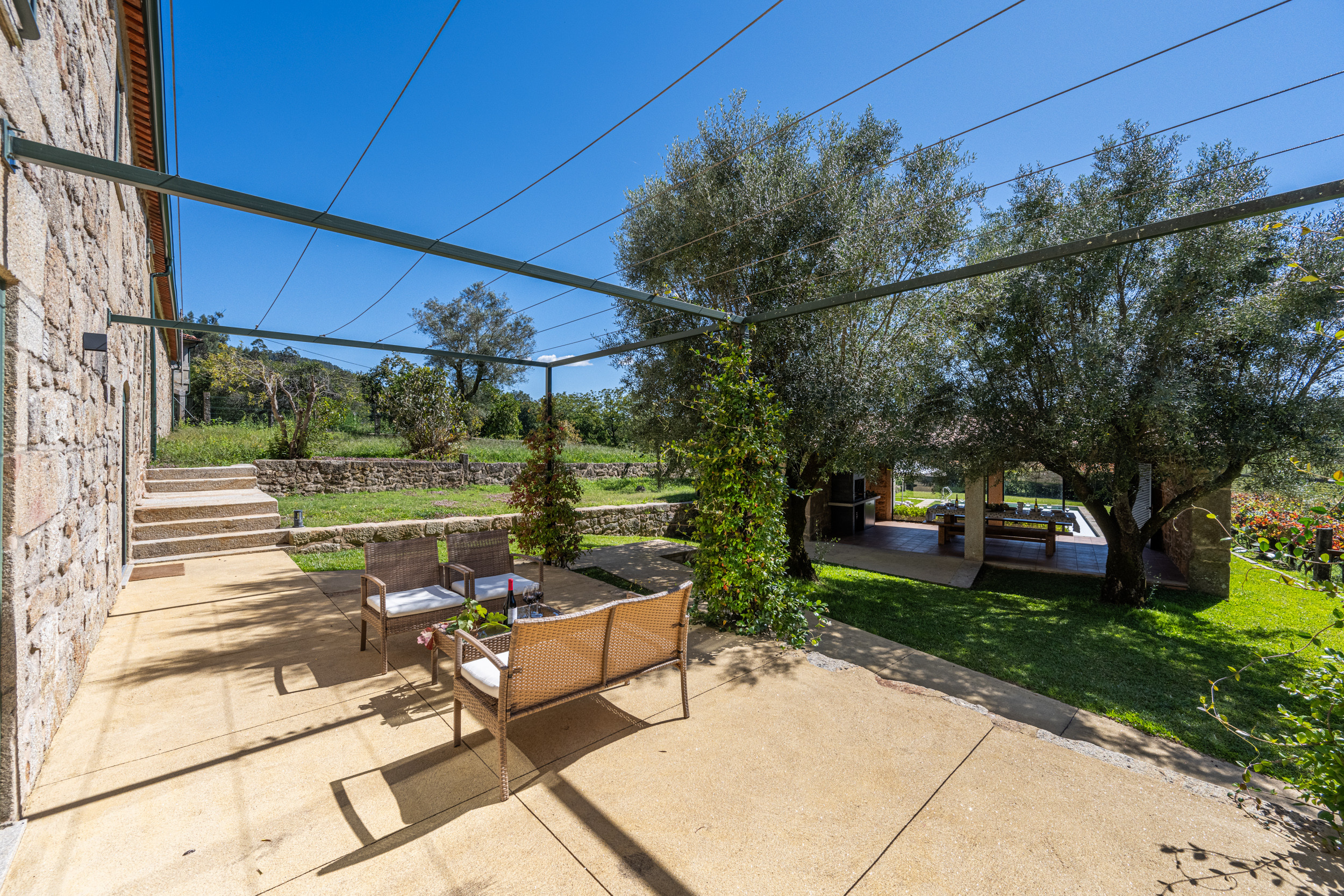Großzügige Terrassen und eine weitläufige Rasenfläche, von der aus die Gäste die schöne Aussicht auf die umliegenden Berge und Weinberge genießen können. Die Grillterrasse ist ideal für Mahlzeiten im Freien.