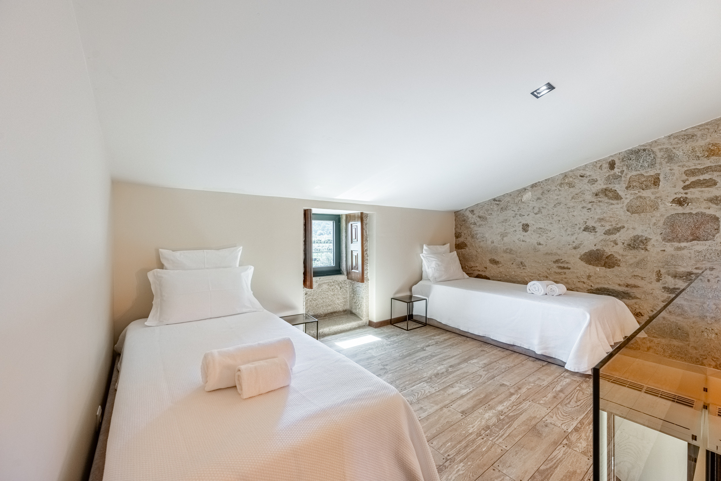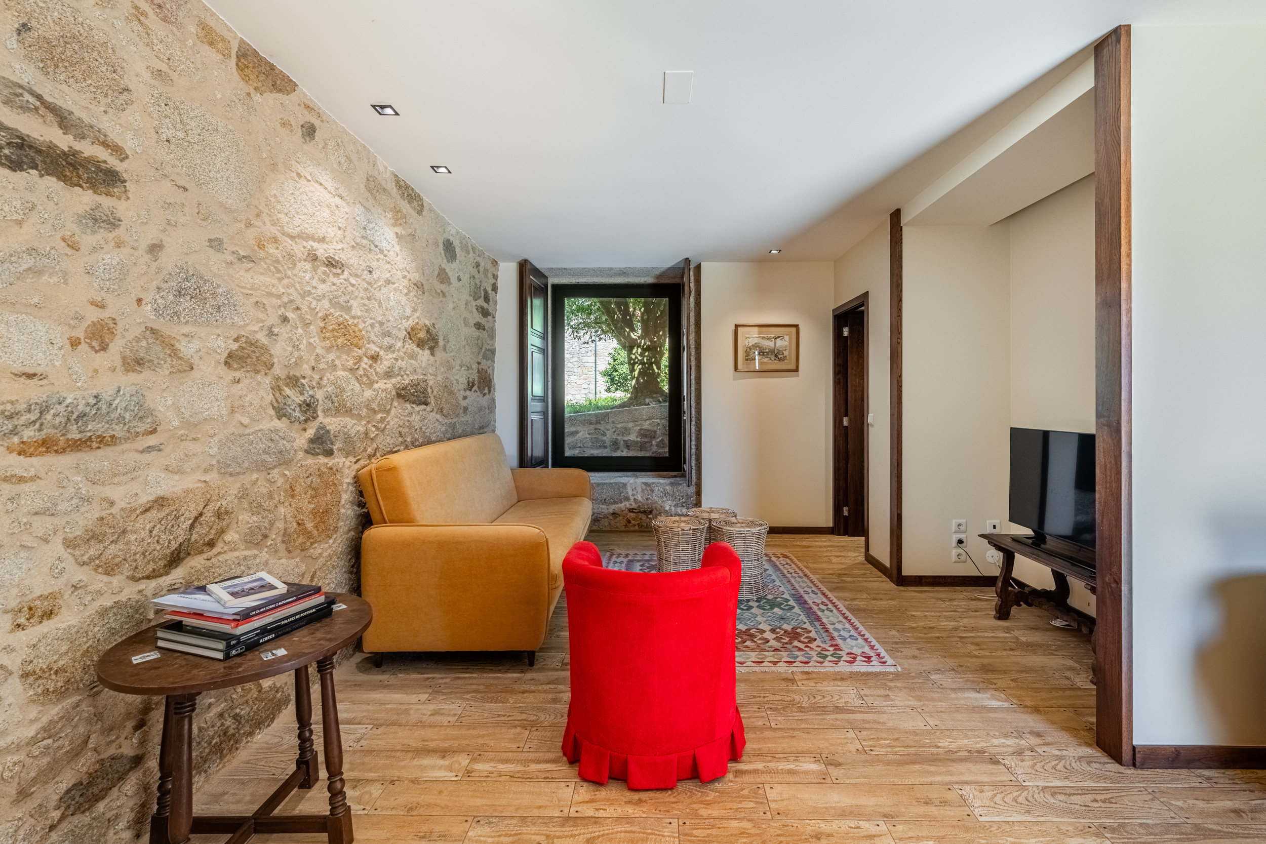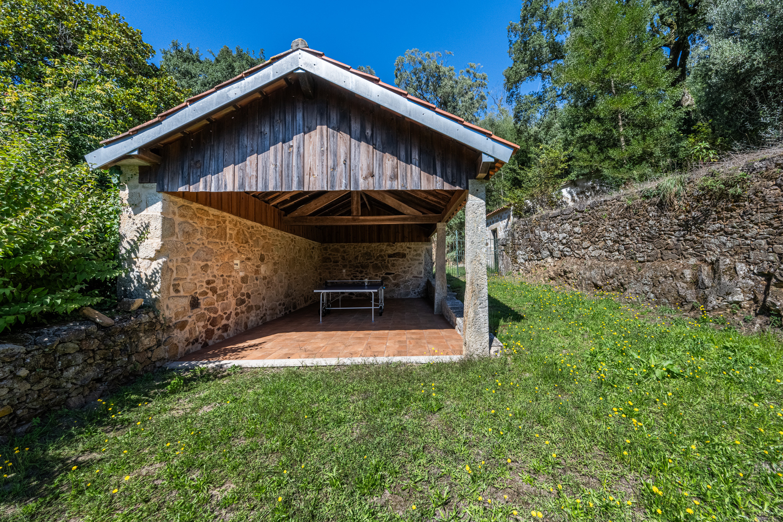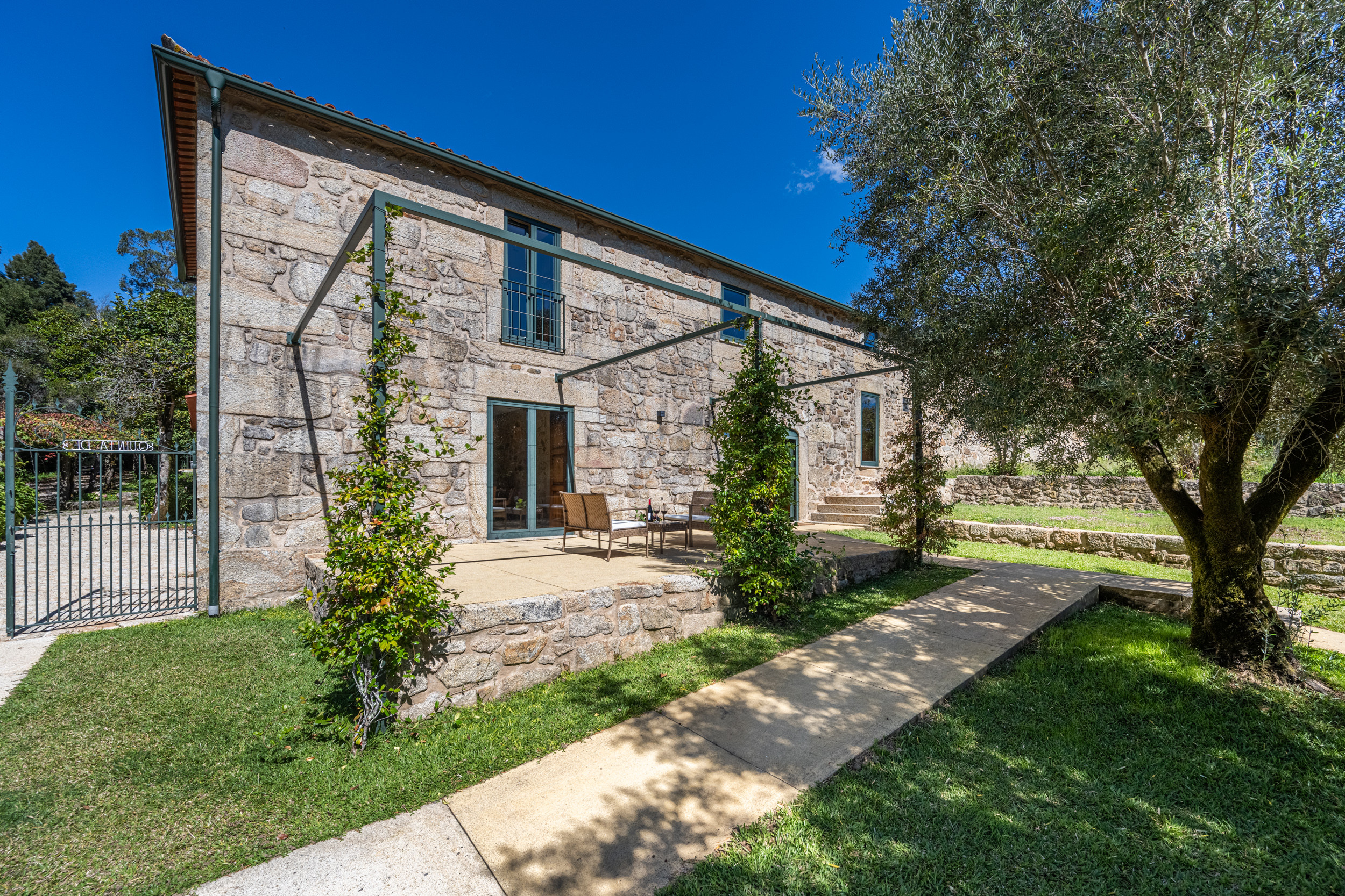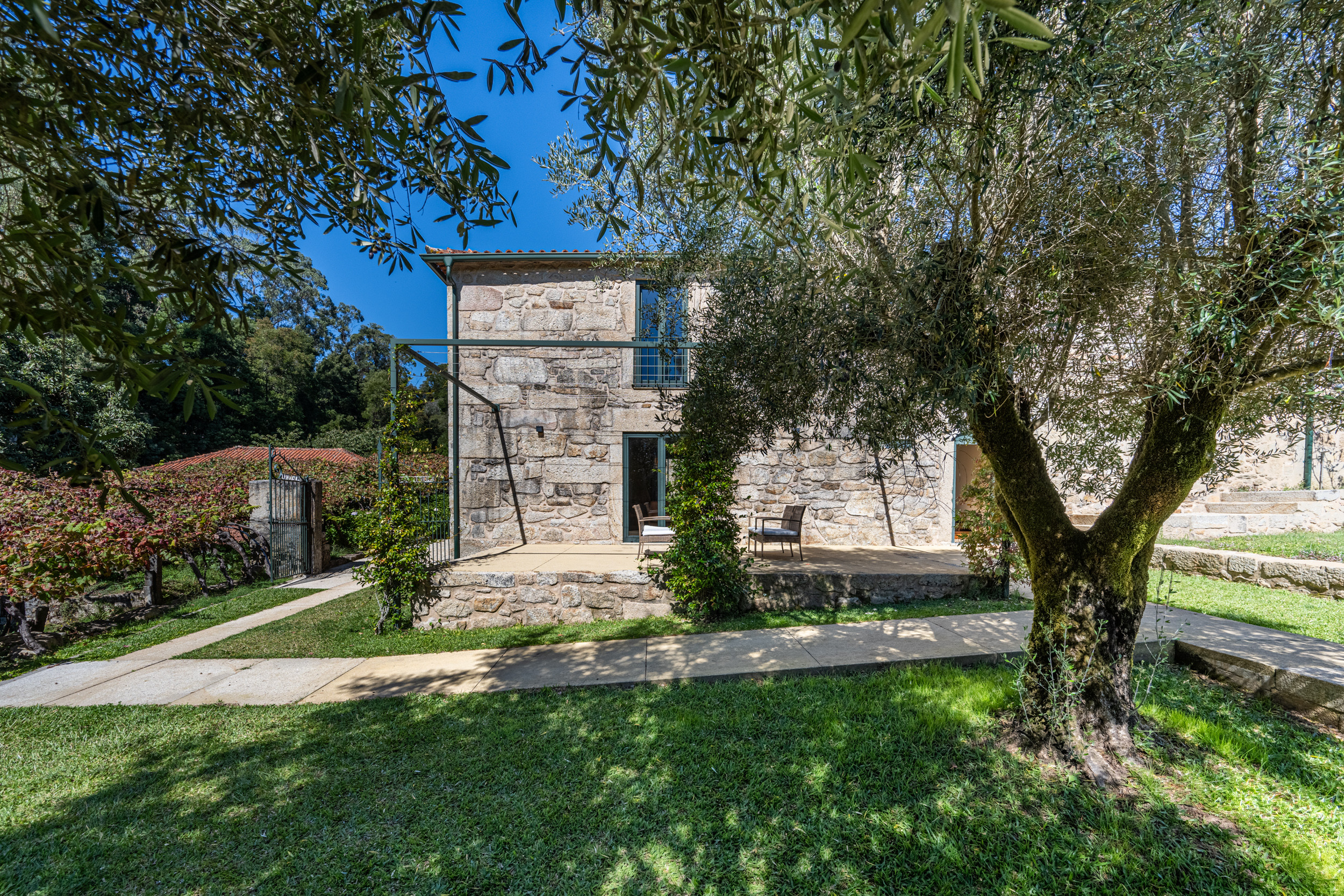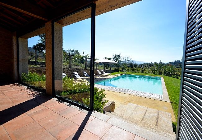 Das gesamte ursprüngliche Gebäude wurde mit restauriertem Mauerwerk erhalten, das perfekt zu den alten Mauern passt. Das einjährige Restaurierungsprojekt wurde für eine BBC-Dokumentationsreihe gefilmt, die im Frühjahr 2009 ausgestrahlt wurde und in der die Macher des Programms die "atemberaubende Kunstfertigkeit der lokalen Handwerker" lobten.Die hellen, geräumigen und lichtdurchfluteten öffentlichen Räume sind offen gestaltet, verfügen jedoch über zwei gut abgegrenzte, separate Sitzbereiche. Der große hölzerne Esstisch, der wie alle Möbel des Hauses von lokalen Handwerkern gefertigt wurde, bietet Platz für 14 Personen. Es gibt eine gut sortierte Bibliothek mit Büchern und DVDs, darunter die Geschichte der Quinta de Agriboa, die den Gästen zur Verfügung steht. Die beiden Schlafzimmer im Hauptgeschoss und das Badezimmer wurden speziell für Rollstuhlfahrer eingerichtet. Die helle, luftige Küche, die einen herrlichen Blick über das Tal auf ein altes Kloster auf einem nahe gelegenen Hügel bietet, ist mit den besten Geräten ausgestattet. Im Erdgeschoss sind die vier Schlafzimmer alle mit eigenem Bad ausgestattet. Das Familienzimmer hat ein großes Kingsize-Bett und handgefertigte Etagenbetten in einer Nische. Im Außenbereich verfügt das Haus über zwei große Terrassenbereiche an der Vorder- und Rückseite, die sich perfekt für Mahlzeiten im Freien oder einfach zum Genießen der Sonne eignen. Ein großer Swimmingpool ist der Mittelpunkt des angelegten Gartens mit seinen Orangen-, Apfel- und Olivenbäumen. Es gibt auch einen Platz für Badminton und andere Aktivitäten. In unmittelbarer Nähe des Hauses haben die Gärtner einen Grill- und Essplatz im Schatten der alten Bäume angelegt.