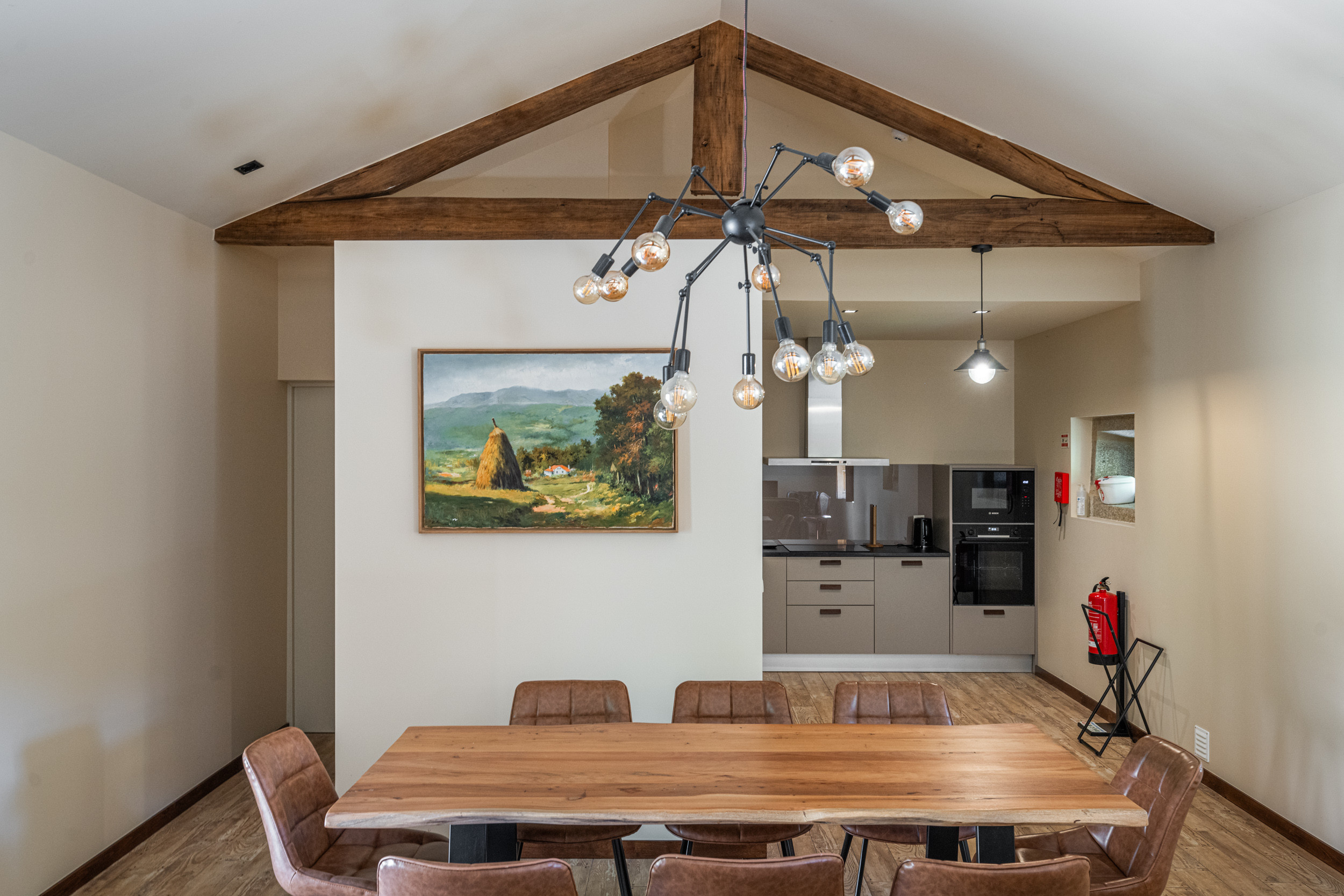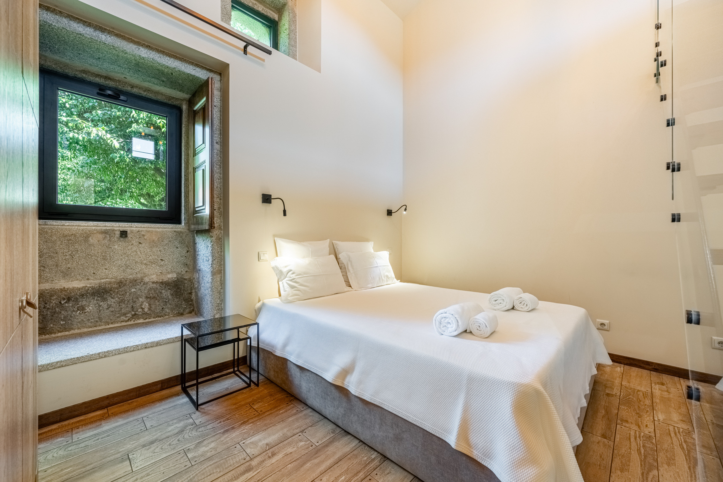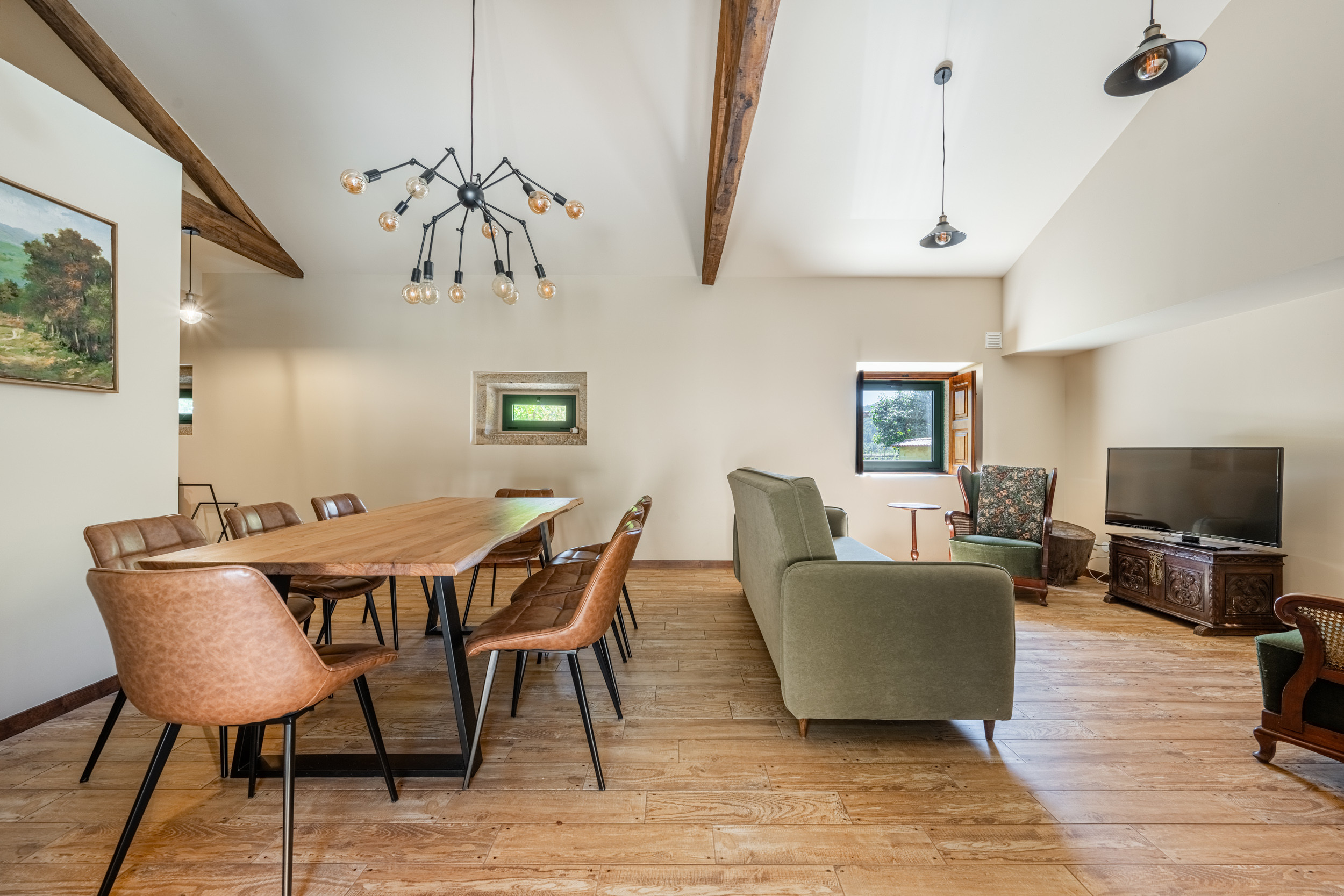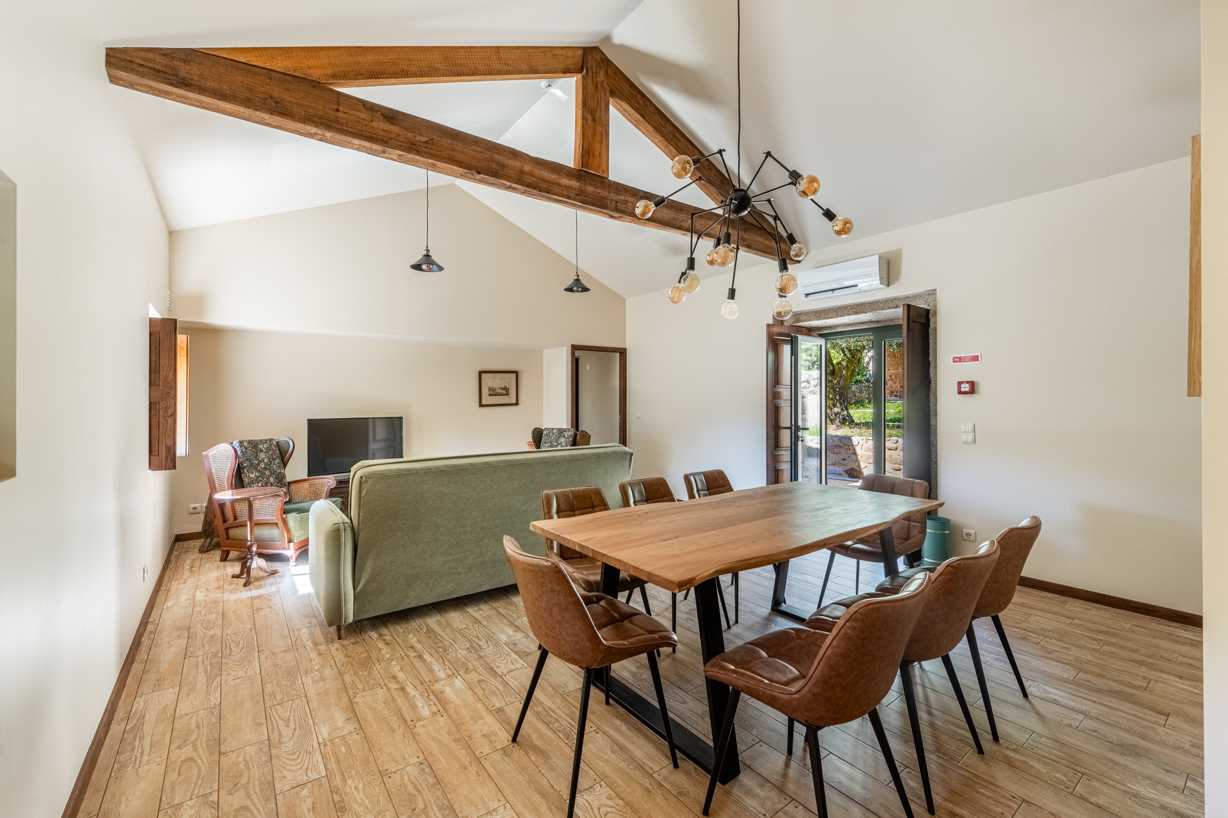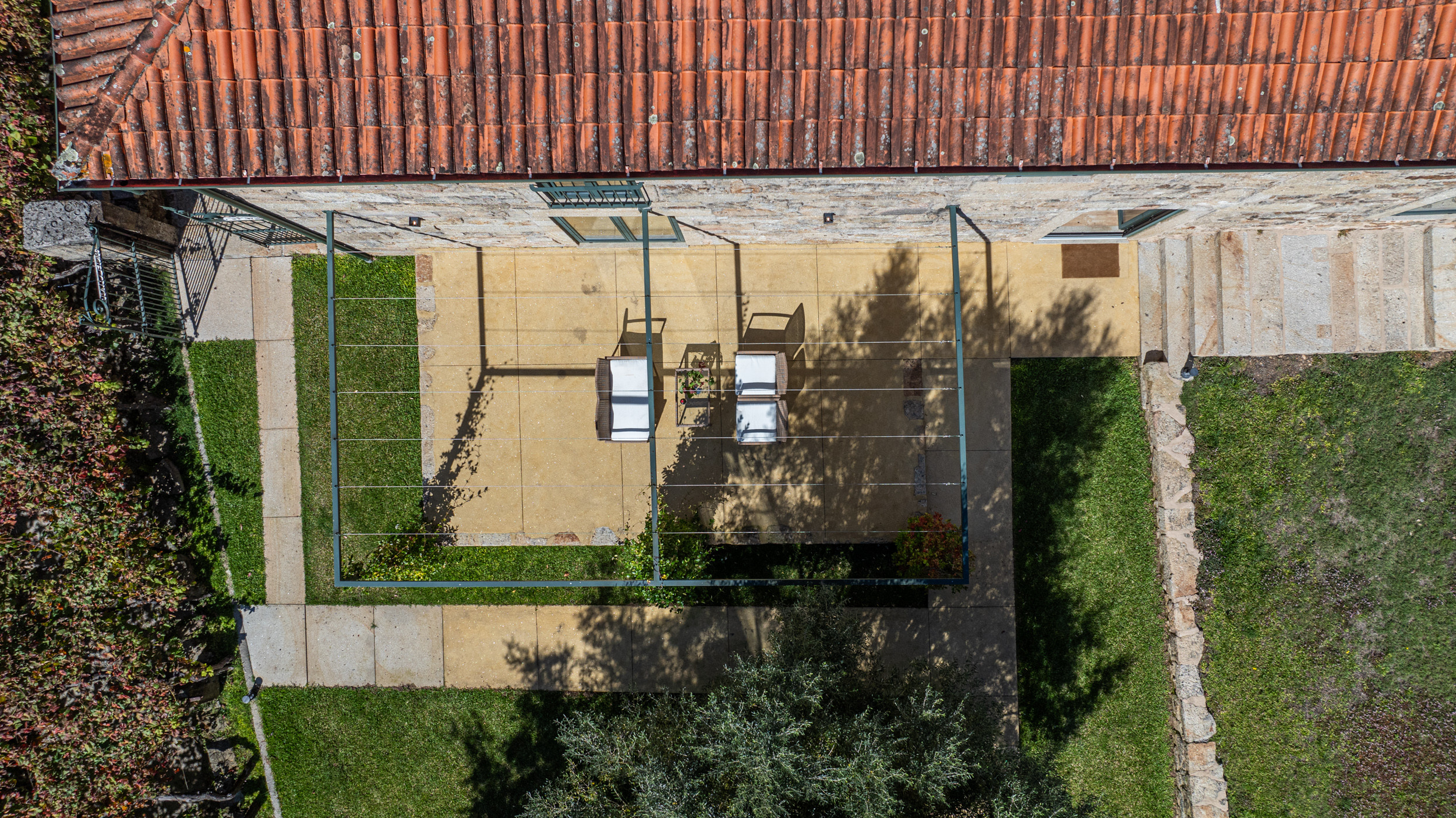 Das gesamte ursprüngliche Gebäude wurde mit restauriertem Mauerwerk erhalten, das perfekt zu den alten Mauern passt. Das einjährige Restaurierungsprojekt wurde für eine BBC-Dokumentationsreihe gefilmt, die im Frühjahr 2009 ausgestrahlt wurde und in der die Macher des Programms die "atemberaubende Kunstfertigkeit der lokalen Handwerker" lobten.Die hellen, geräumigen und lichtdurchfluteten öffentlichen Räume sind offen gestaltet, verfügen jedoch über zwei gut abgegrenzte, separate Sitzbereiche. Der große hölzerne Esstisch, der wie alle Möbel des Hauses von lokalen Handwerkern gefertigt wurde, bietet Platz für 14 Personen. Es gibt eine gut sortierte Bibliothek mit Büchern und DVDs, darunter die Geschichte der Quinta de Agriboa, die den Gästen zur Verfügung steht. Die beiden Schlafzimmer im Hauptgeschoss und das Badezimmer wurden speziell für Rollstuhlfahrer eingerichtet. Die helle, luftige Küche, die einen herrlichen Blick über das Tal auf ein altes Kloster auf einem nahe gelegenen Hügel bietet, ist mit den besten Geräten ausgestattet. Im Erdgeschoss sind die vier Schlafzimmer alle mit eigenem Bad ausgestattet. Das Familienzimmer hat ein großes Kingsize-Bett und handgefertigte Etagenbetten in einer Nische. Im Außenbereich verfügt das Haus über zwei große Terrassenbereiche an der Vorder- und Rückseite, die sich perfekt für Mahlzeiten im Freien oder einfach zum Genießen der Sonne eignen. Ein großer Swimmingpool ist der Mittelpunkt des angelegten Gartens mit seinen Orangen-, Apfel- und Olivenbäumen. Es gibt auch einen Platz für Badminton und andere Aktivitäten. In unmittelbarer Nähe des Hauses haben die Gärtner einen Grill- und Essplatz im Schatten der alten Bäume angelegt.