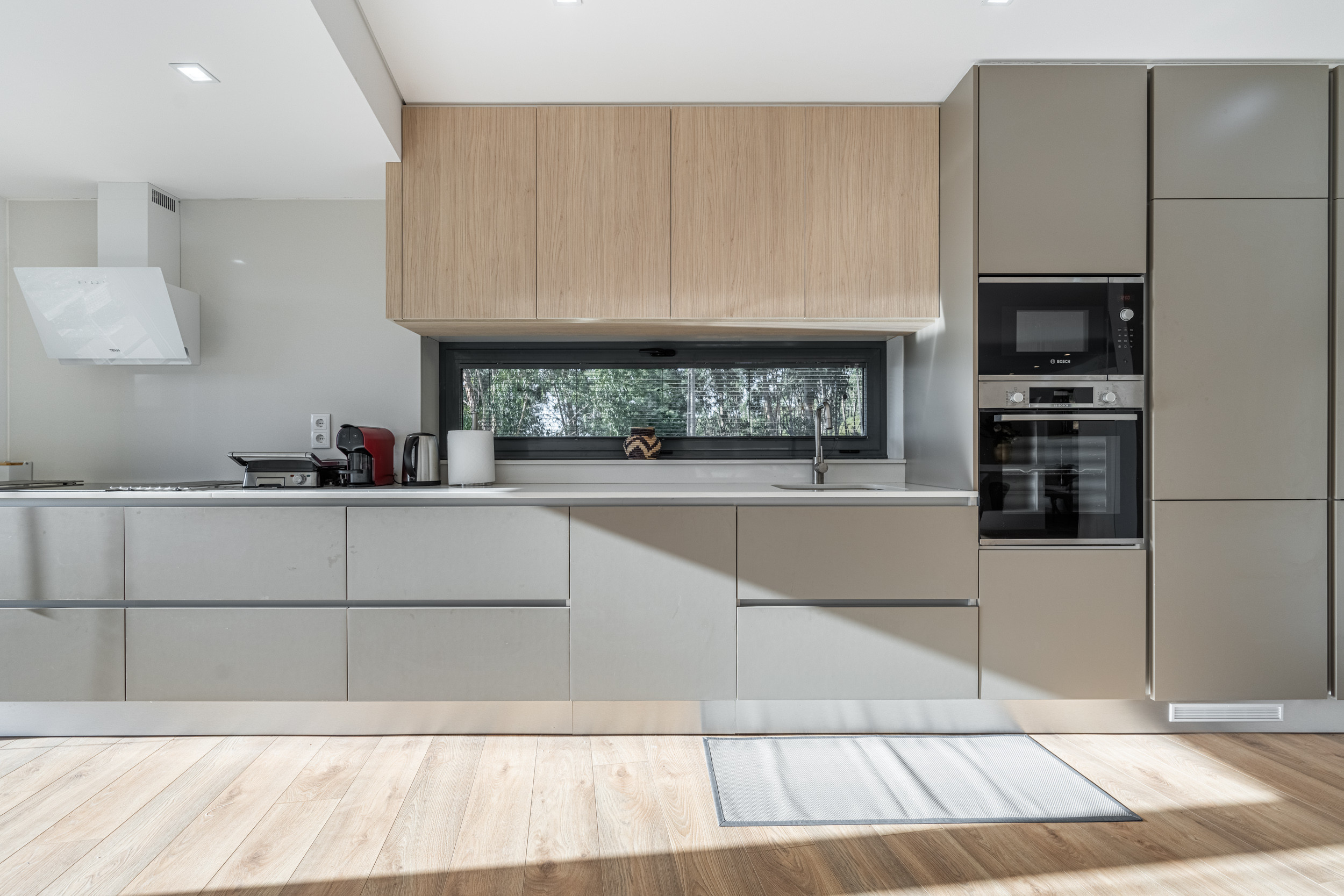 El interior combina un diseño moderno con detalles vintage cuidadosamente elegidos, creando una atmósfera cálida, elegante y llena de carácter. La sala de estar de planta abierta, el comedor y la cocina totalmente equipada forman un espacio luminoso e invitador ideal para relajarse y compartir comidas juntos.