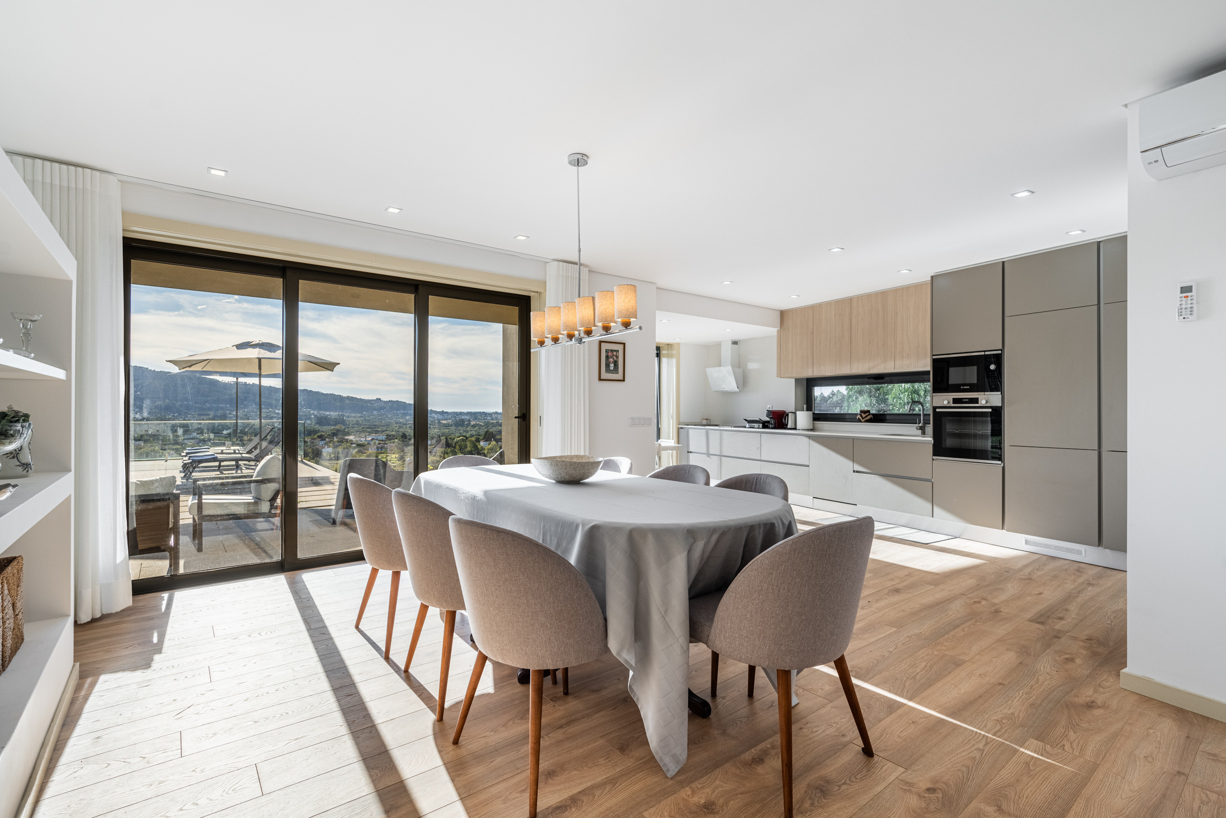 Amplio salón / comedor con cómodos asientos, televisión por cable e internet wifi. Mesa de comedor con capacidad para 6 personas. Cocina totalmente equipada. Grandes puertas que dan a la zona de terraza delantera ideal para comer al aire libre disfrutando de las magníficas vistas.