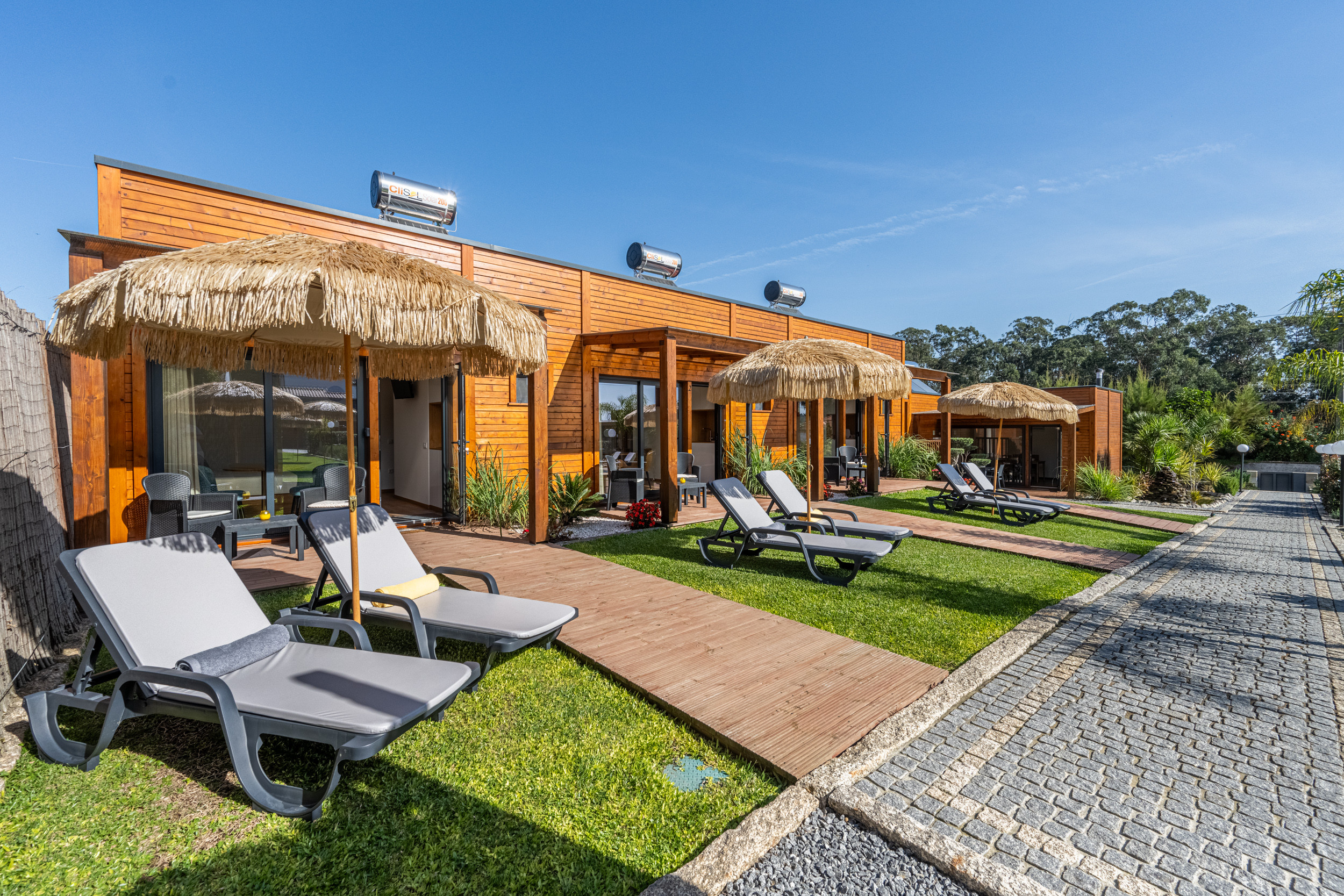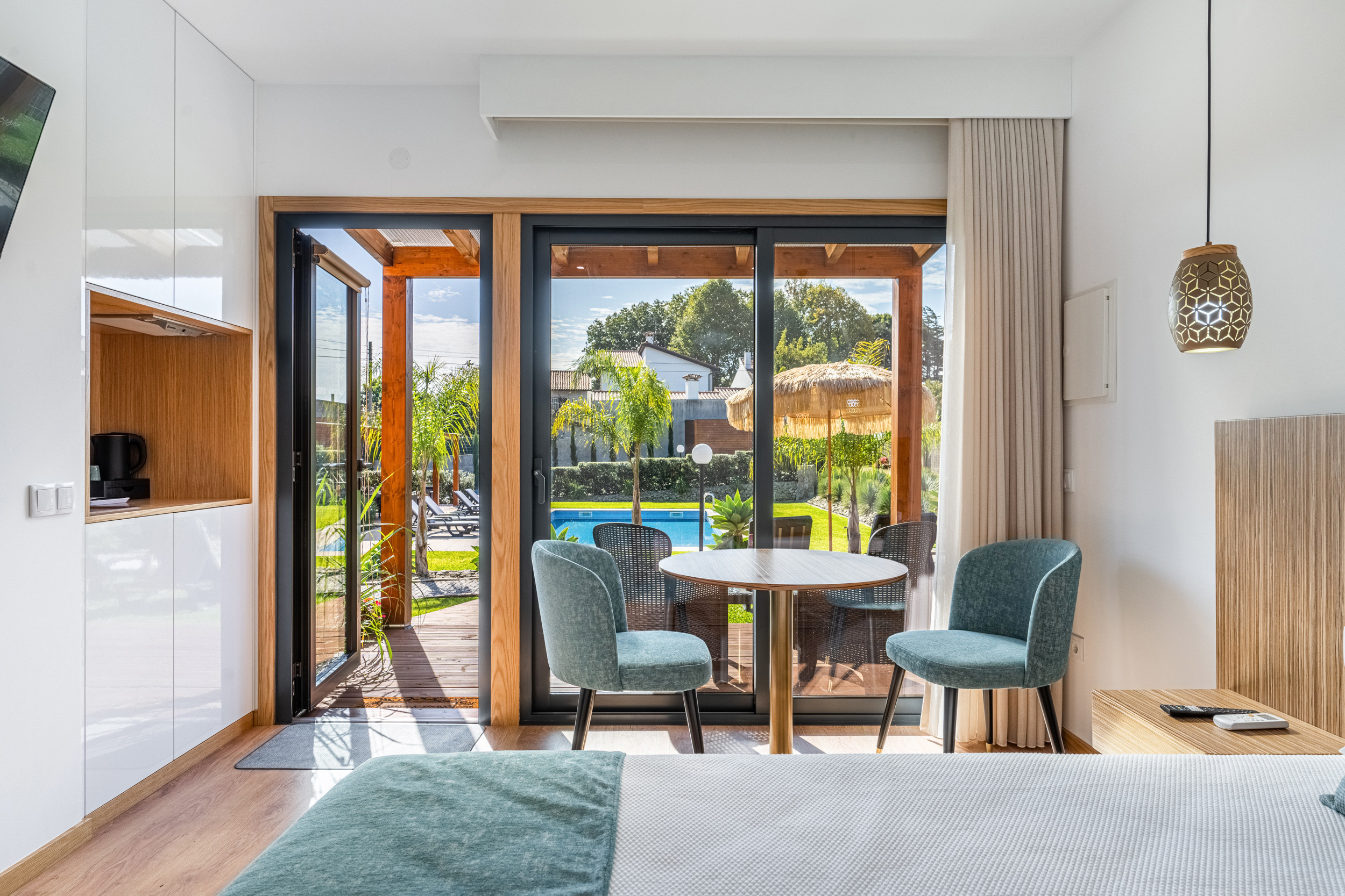 Tres habitaciones dobles con baño, con minibar privado y puertas que dan a un patio con mesa y sillas y zona de piscina principal