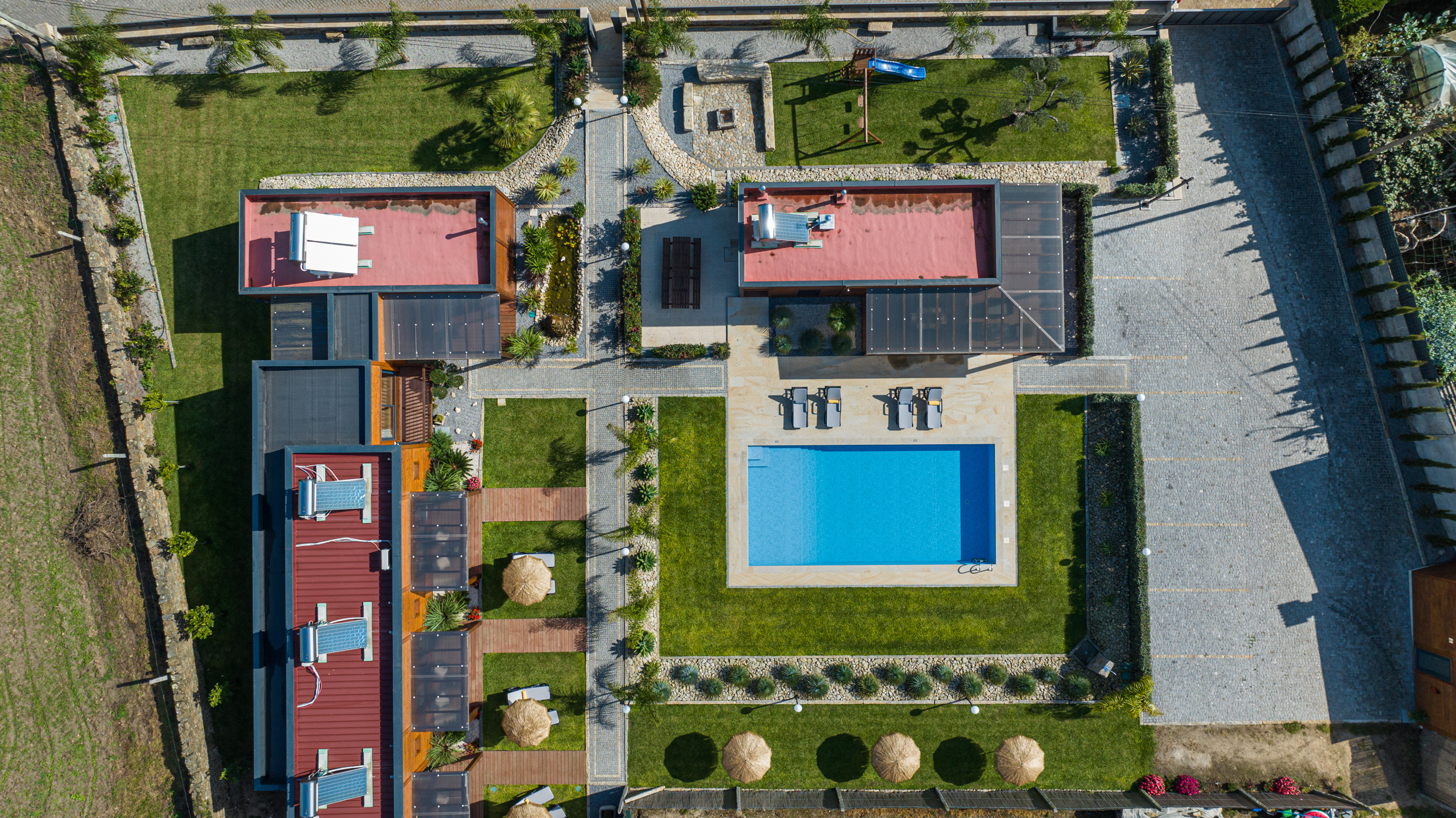 Además de la piscina privada, los huéspedes tienen a su disposición una pista de tenis, un pequeño campo de fútbol 5 - una delicia para niños y adultos - y una pista de voleibol.
