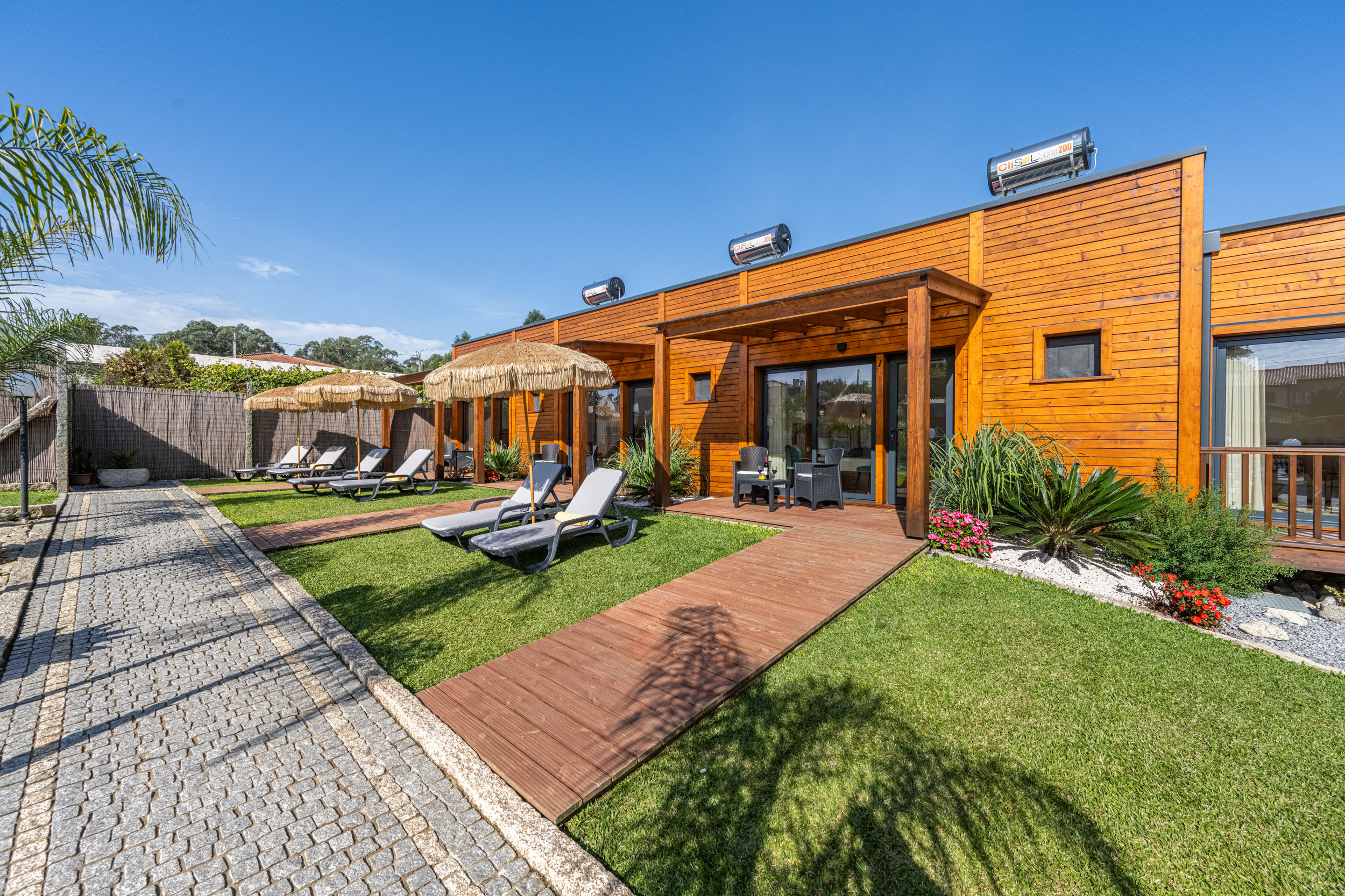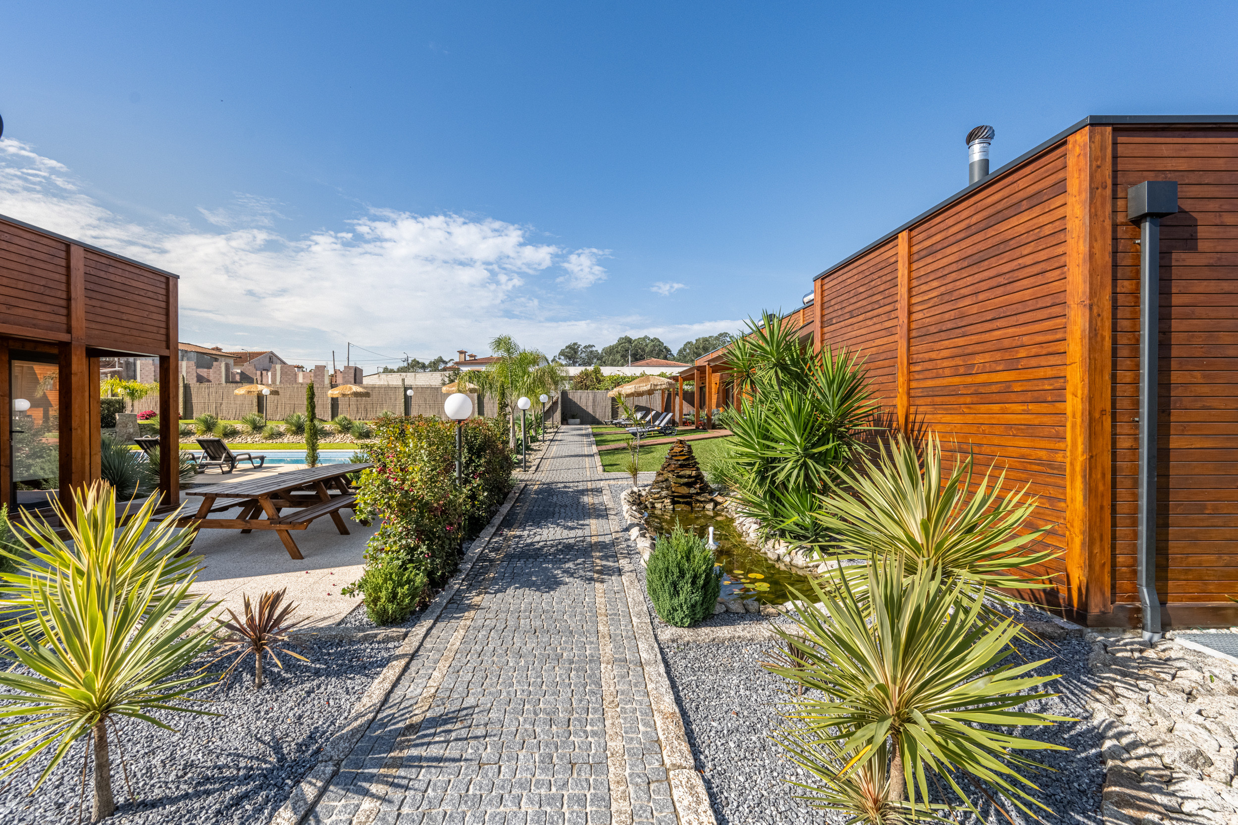 En la casa principal, la elegancia y la comodidad te esperan. Encontrarás una cocina espaciosa, una sala de estar acogedora, tres dormitorios dobles, cada uno con su propio baño en suite y minibar privado, un dormitorio doble y un cuarto de ducha. Cada habitación ha sido diseñada cuidadosamente para combinar calidez, comodidad y estilo, garantizando una estancia relajante para cada huésped.