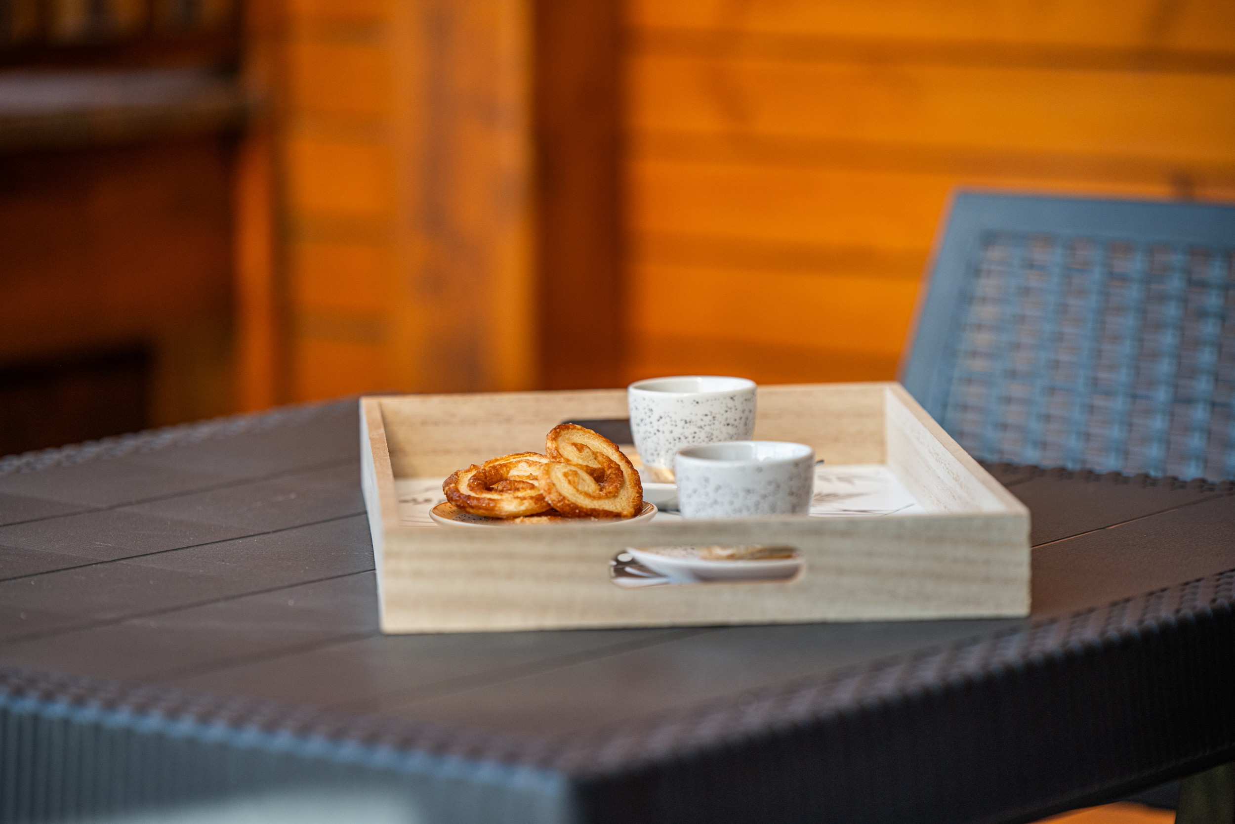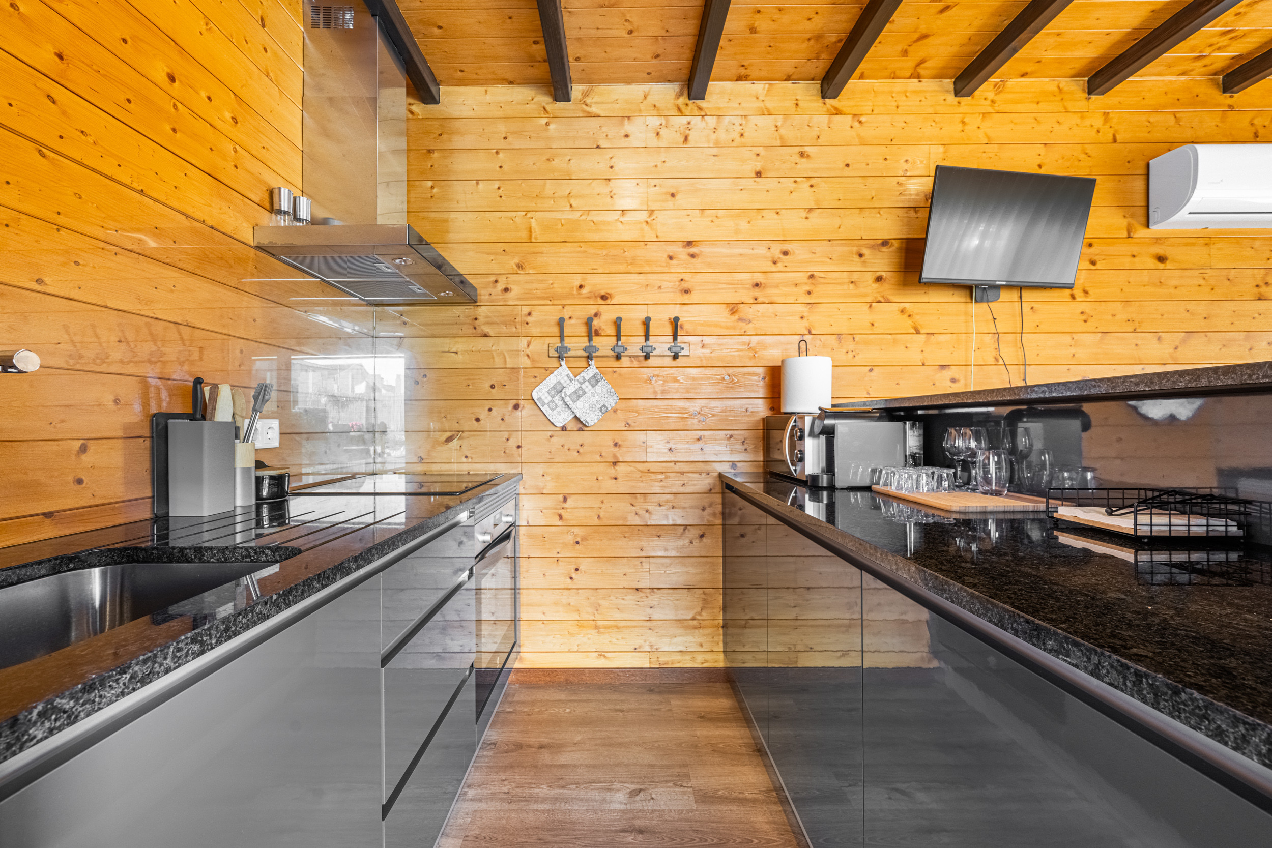 La propriété comprend deux bâtiments en bois. L'annexe charmante offre une cuisine entièrement équipée et un salon douillet, avec un espace repas pour huit personnes — parfait pour des repas partagés et une vie extérieure facile.