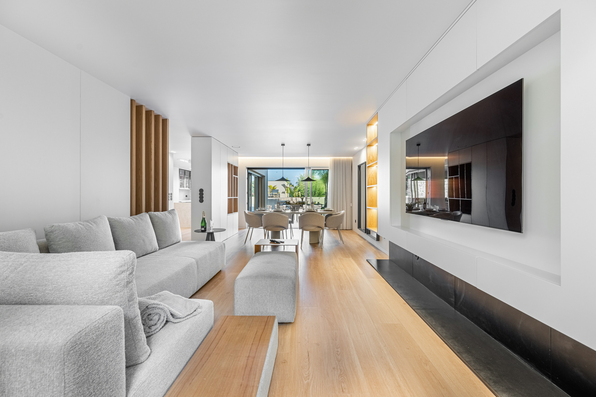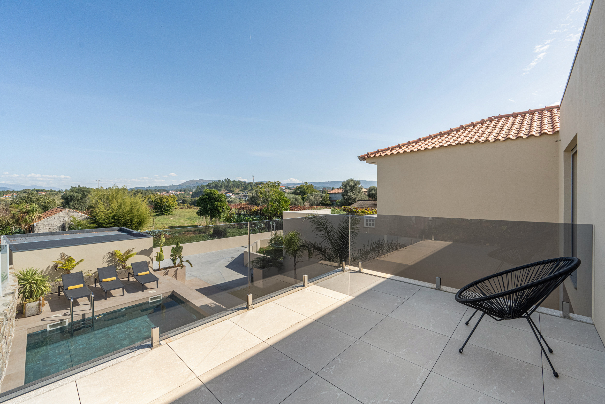 La cuisine, le salon et la salle à manger à aire ouverte, lumineux et aérés, sont idéaux pour les réunions familiales ou les soirées tranquilles avec une vue sur la piscine, le jardin et la chaîne de montagnes Serra d'Arga au loin. La cuisine entièrement équipée vous permet de préparer facilement vos repas, tandis que l’espace de vie confortable vous invite à vous détendre.