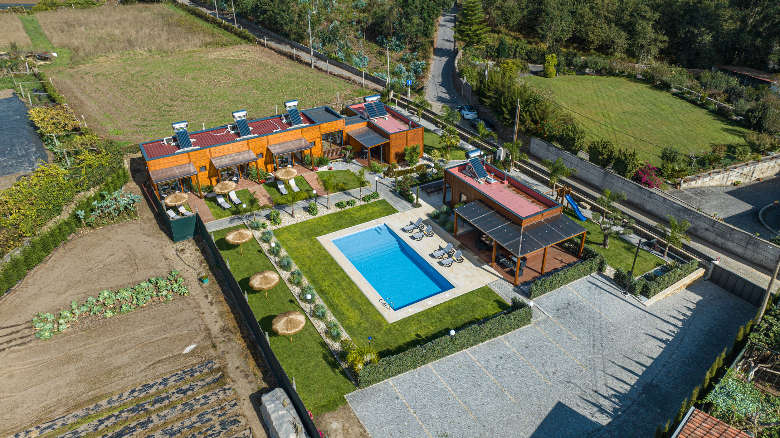 Na casa principal, o conforto elegante espera. Encontrará uma cozinha espaçosa, uma sala de estar acolhedora, três quartos duplos, cada um com casa de banho privativa e minibar, um quarto duplo e uma casa de banho com chuveiro. Cada divisão foi cuidadosamente concebida para combinar calor, conforto e estilo, garantindo uma estadia repousante para todos os hóspedes.