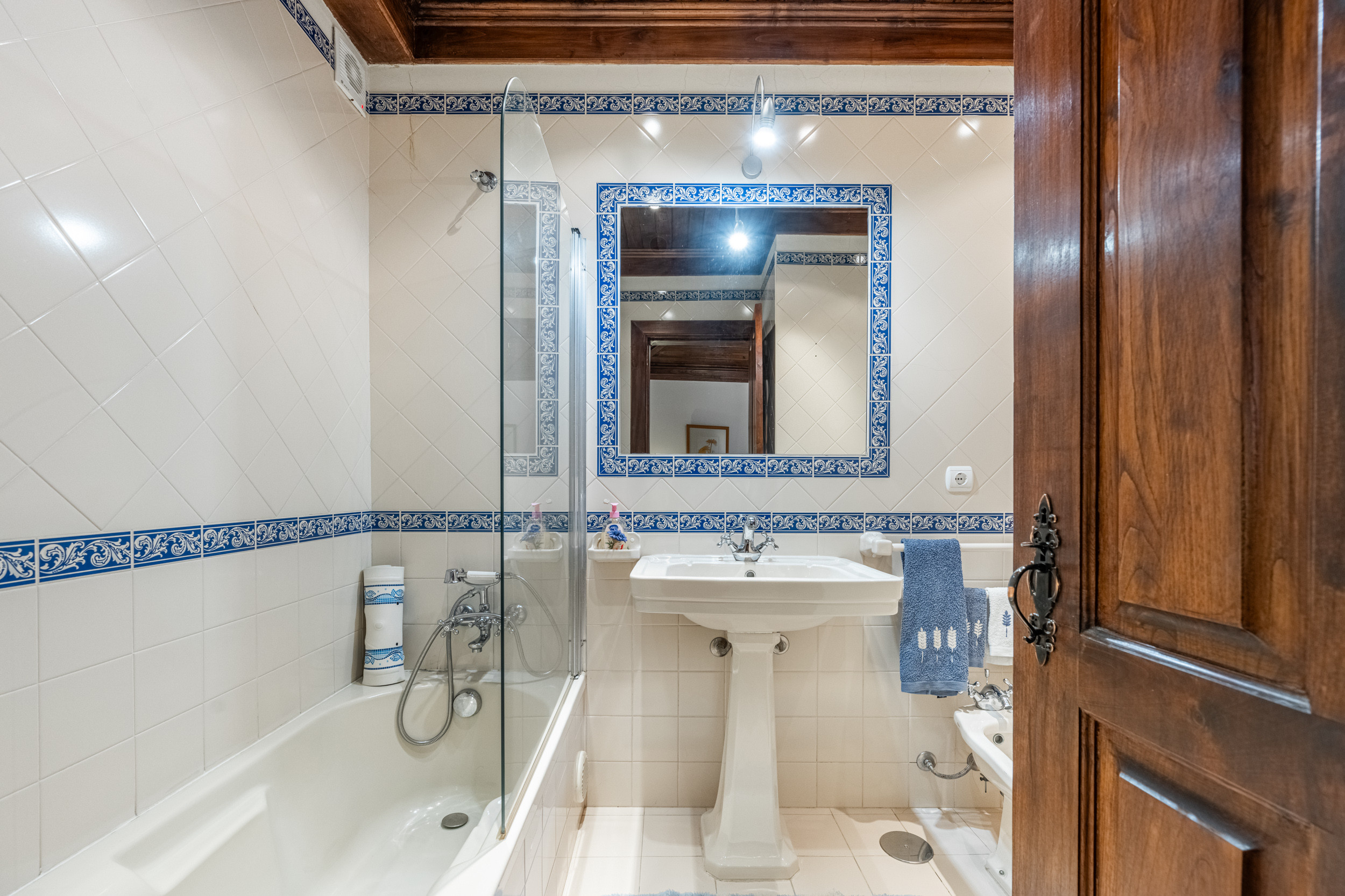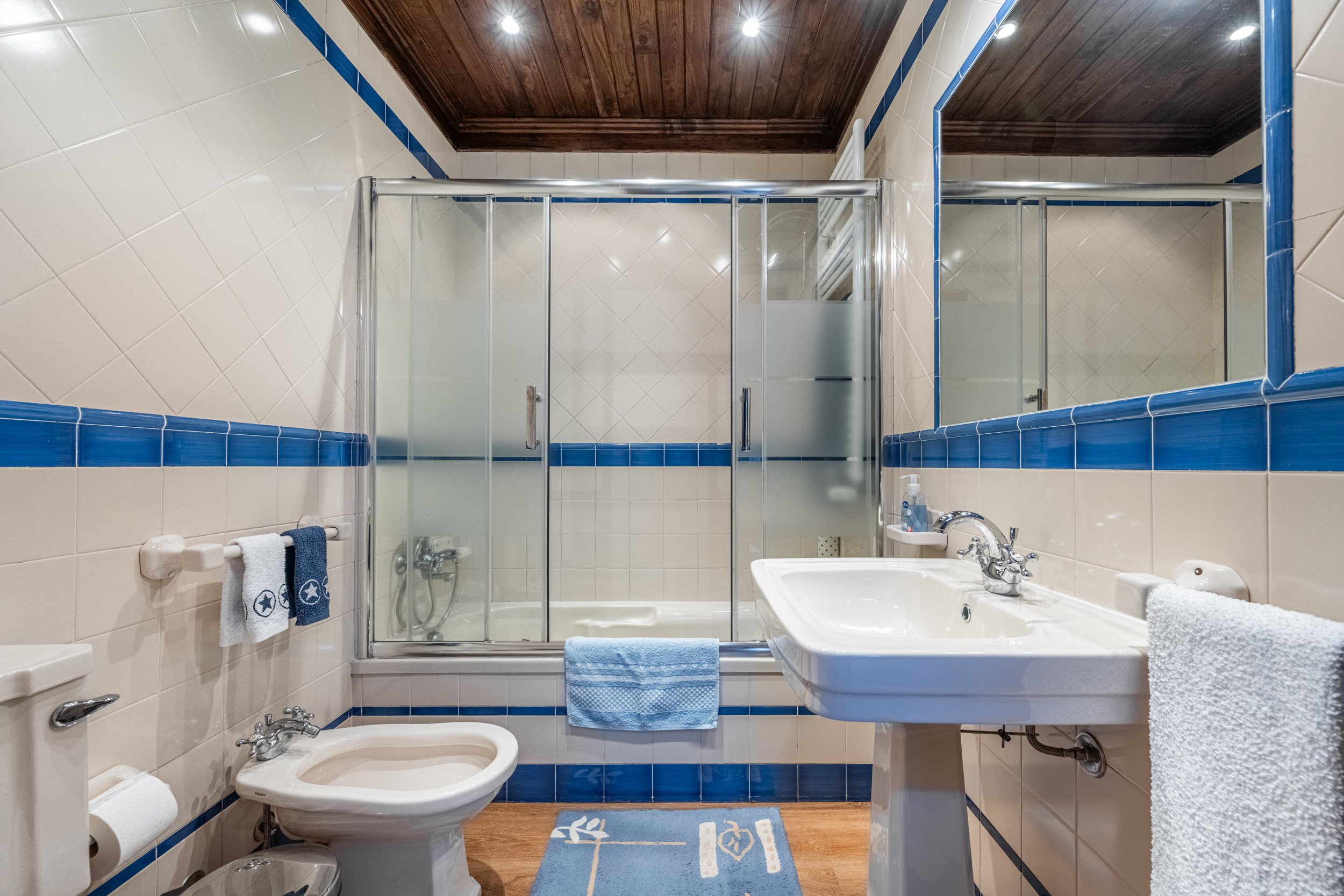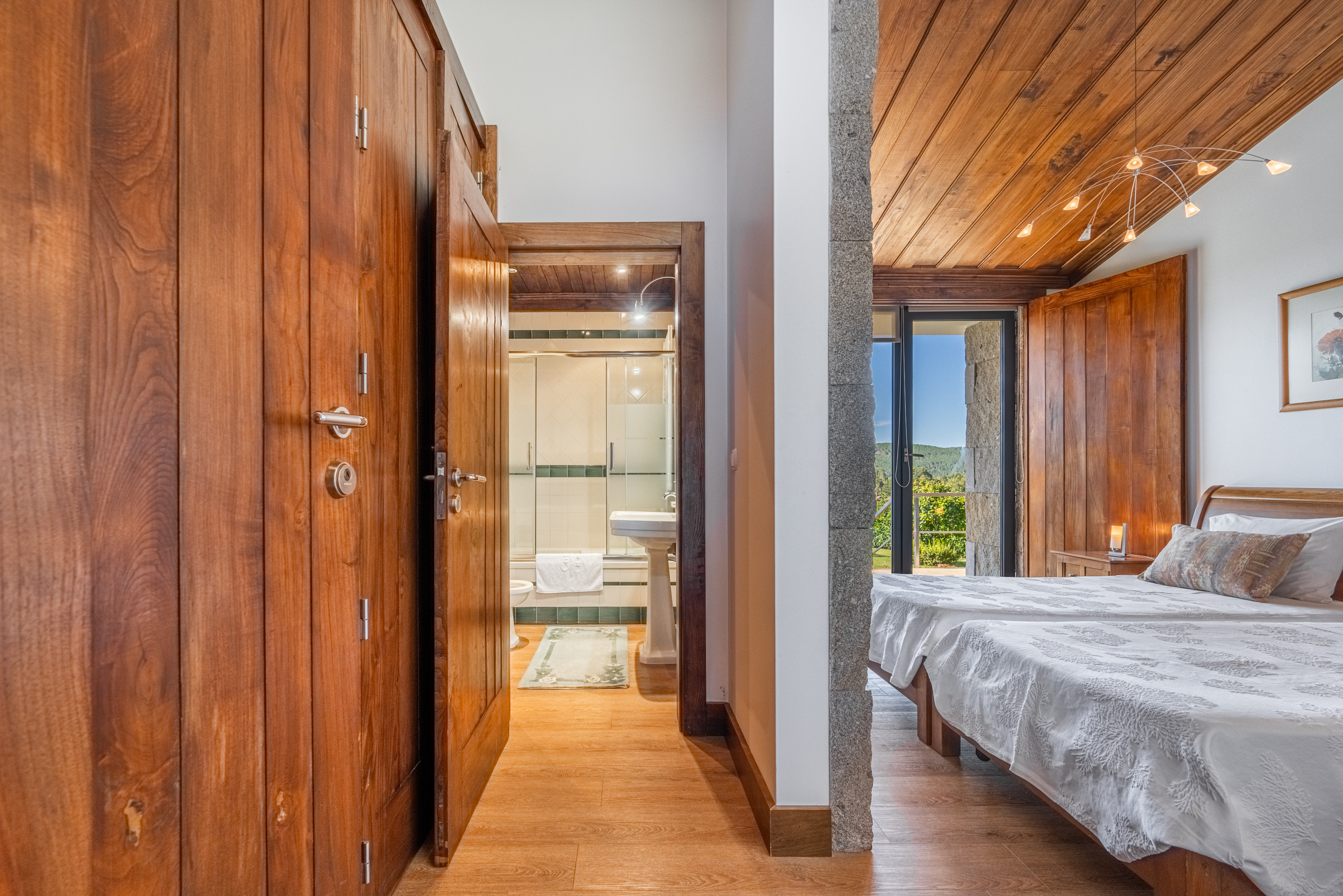 Piso superior: Quarto principal duplo com casa de banho privativa. Abertura da porta para varanda coberta. Sala de estar com sofás, lareira aberta e TV por cabo. Portas que abrem para uma varanda coberta com vista para o pátio e casa de campo de dois quartos. Dois degraus que conduzem à ala dos quartos - três quartos duplos com casa de banho privativa e portas que conduzem à varanda que percorre todo o comprimento da casa. Vistas deliciosas sobre o vale. Degraus que conduzem à zona da piscina. Terraço coberto com mesa e cadeiras.