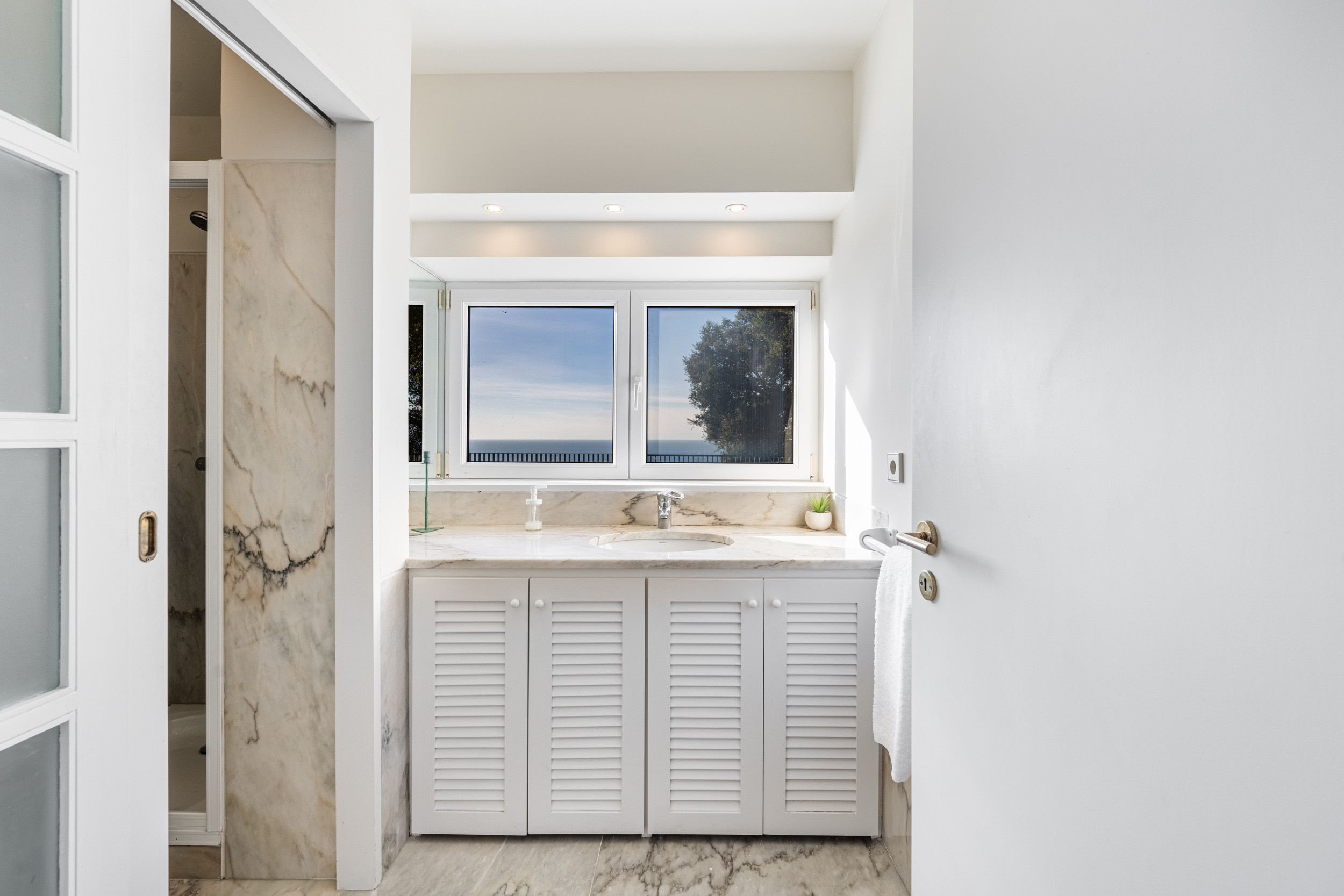 One double bedroom and one twin bedroom sharing a full bathroom. One master bedroom with ensuite shower room. All three bedrooms have sliding doors that open onto the pool terrace and garden with uninterrupted sea views.