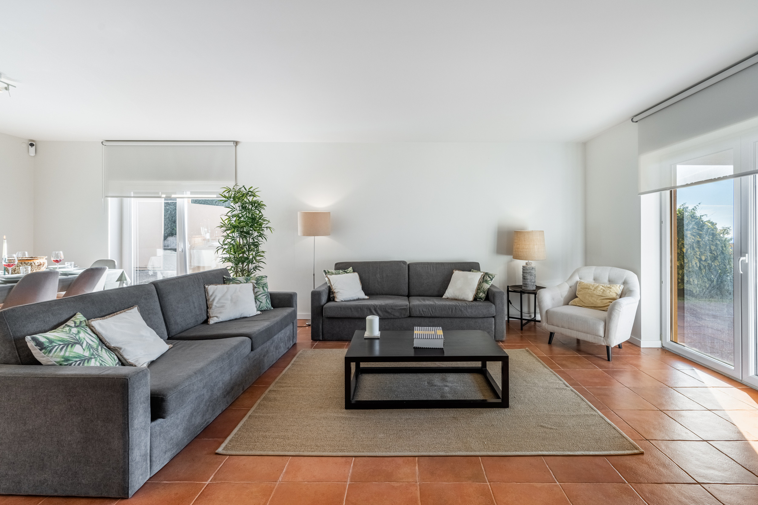 The spacious open-plan living and dining area connects indoor and outdoor spaces through large sliding glass doors leading to a paved, partially covered terrace—perfect for alfresco dining.