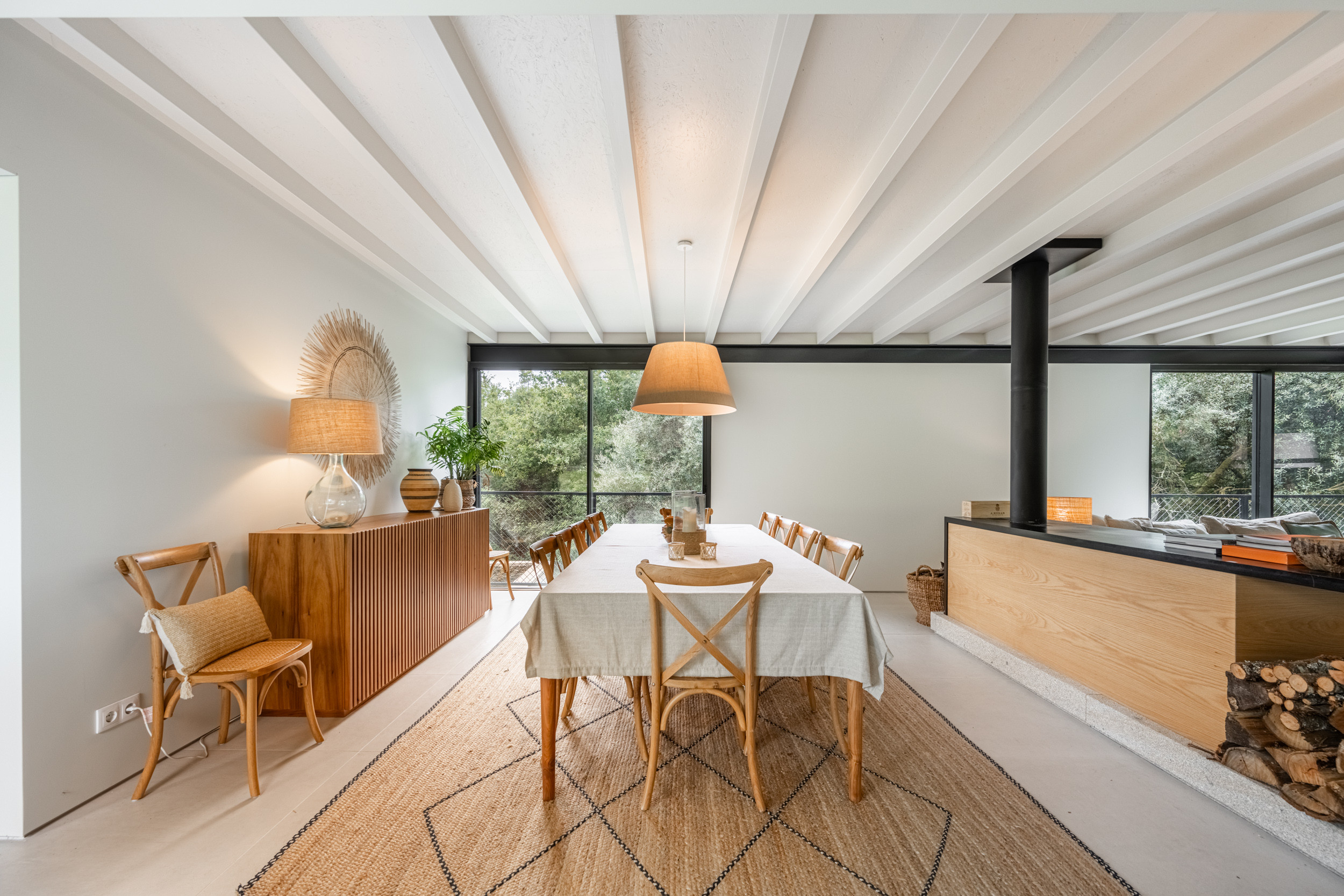 Inside, the villa has been designed with relaxation in mind. The bright open-plan living and dining room is beautifully decorated and opens directly onto the patio and swimming pool area, creating a seamless flow between indoor and outdoor living. A fully equipped kitchen provides everything you need to prepare meals at home, while a charming dining room with seating for ten sets the perfect stage for family gatherings and long dinners together.